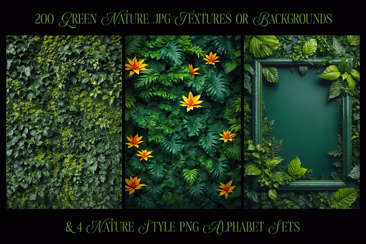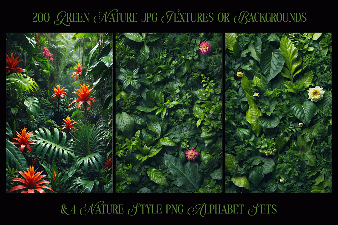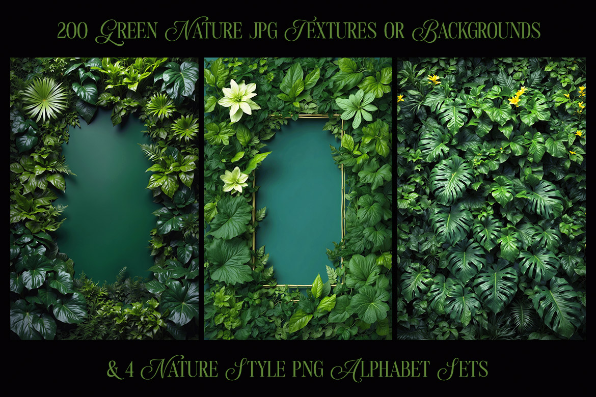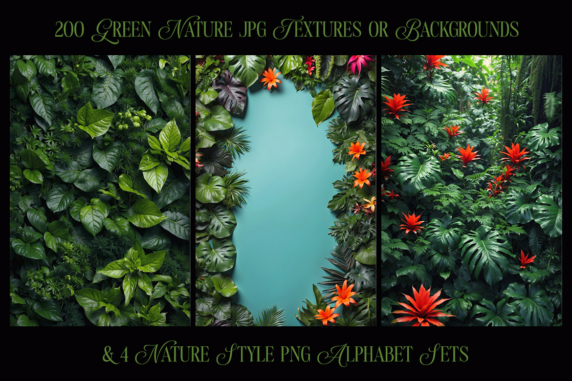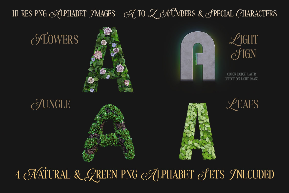 - 4 nature style PNG alphabet sets – All letters from A – Z (CAPS and small letters) & numbers + special characters (3000 x 3000 pix)