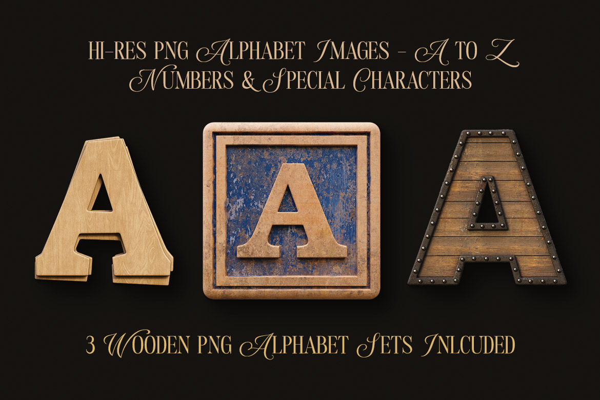 - 3 wooden PNG alphabet sets – All letters from A – Z & numbers + special characters (3000 x 3000 pix)