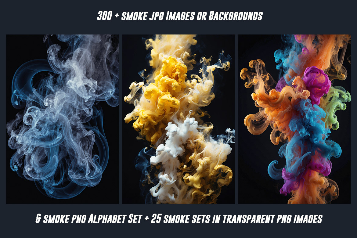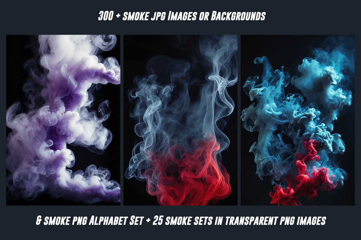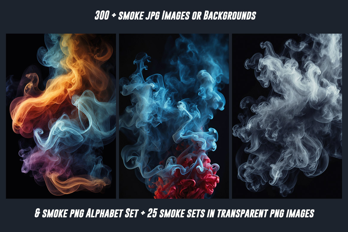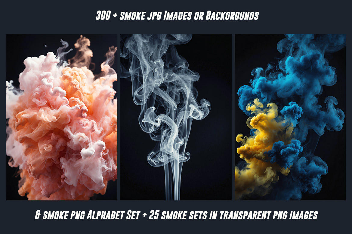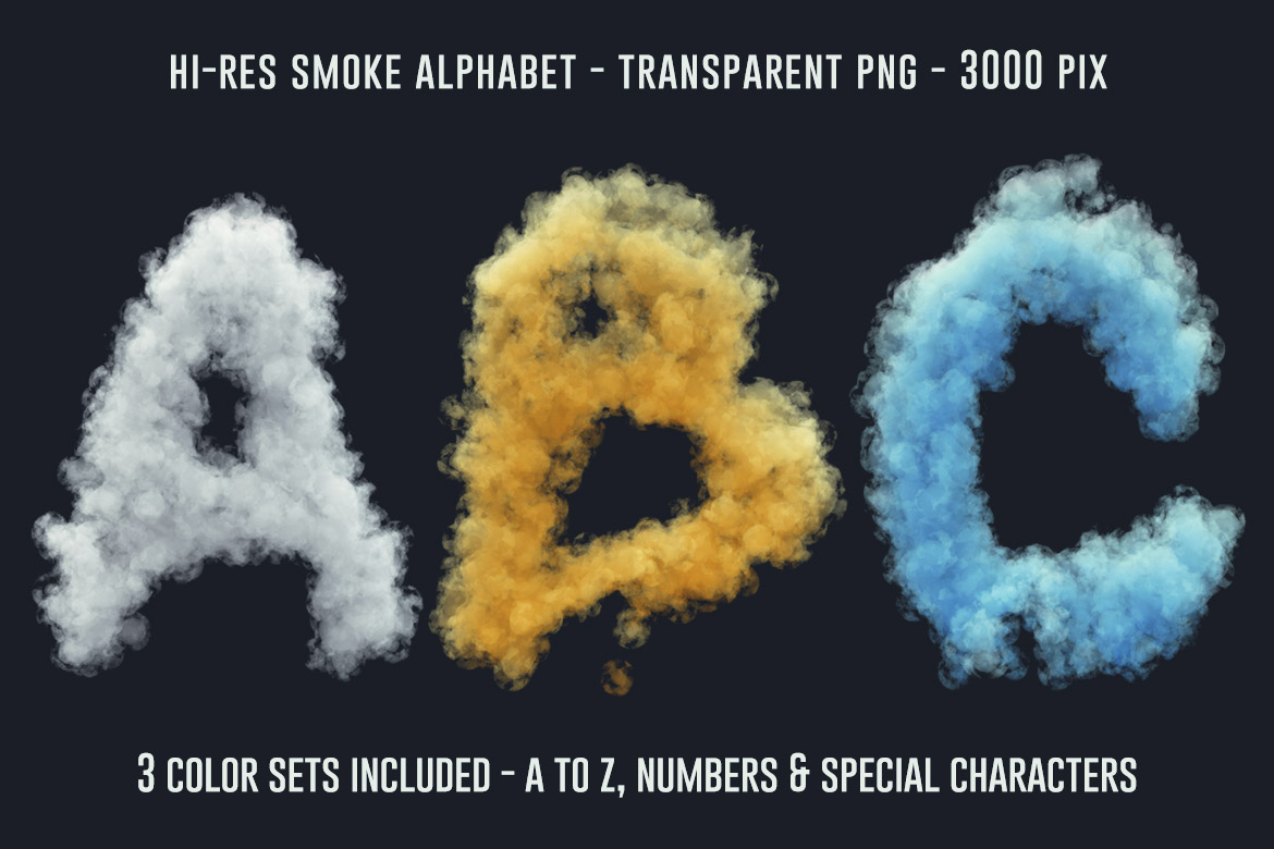 - smoke PNG alphabet set in 3 color versions – All letters from A – Z & numbers + special characters (3000 x 3000 pix)