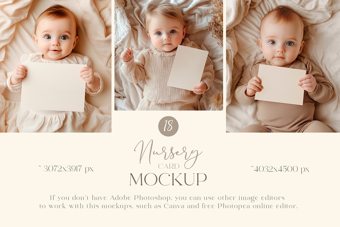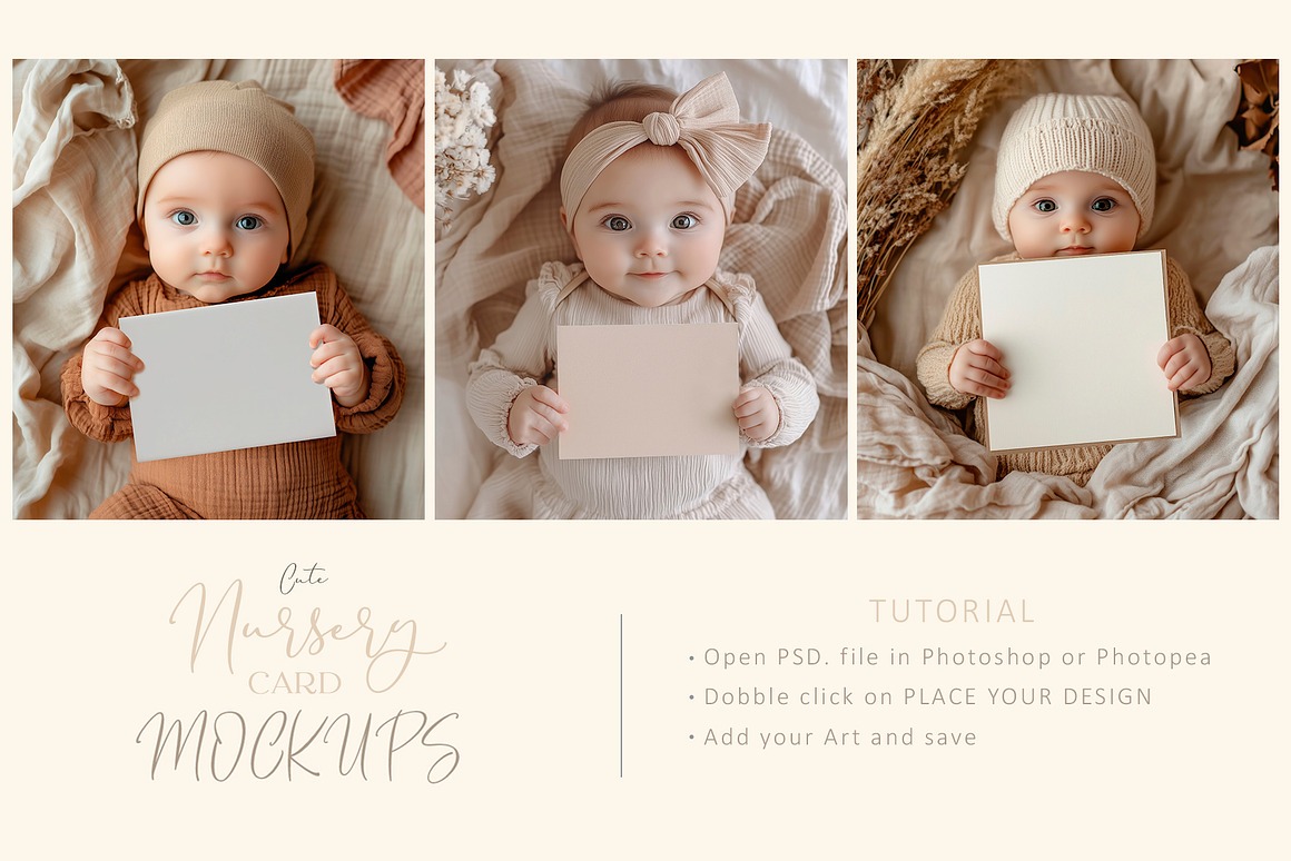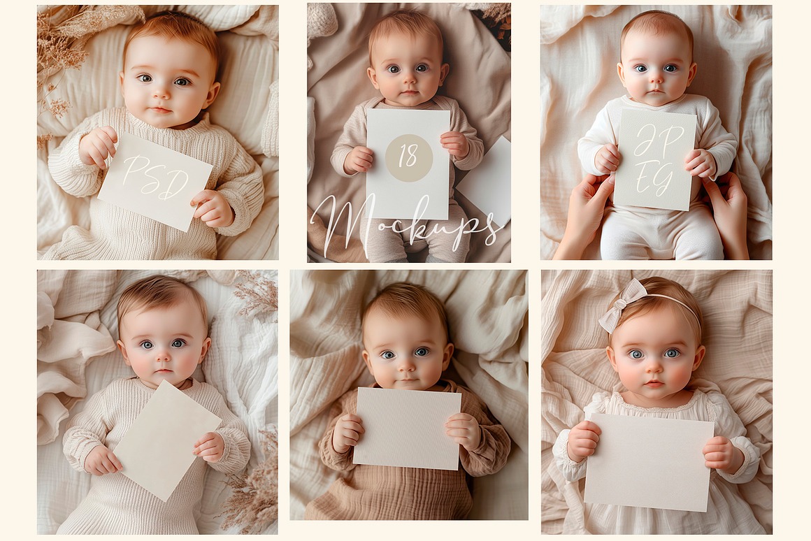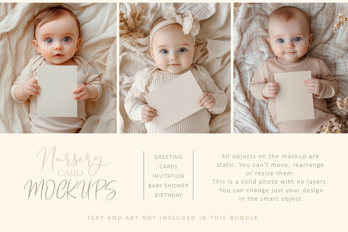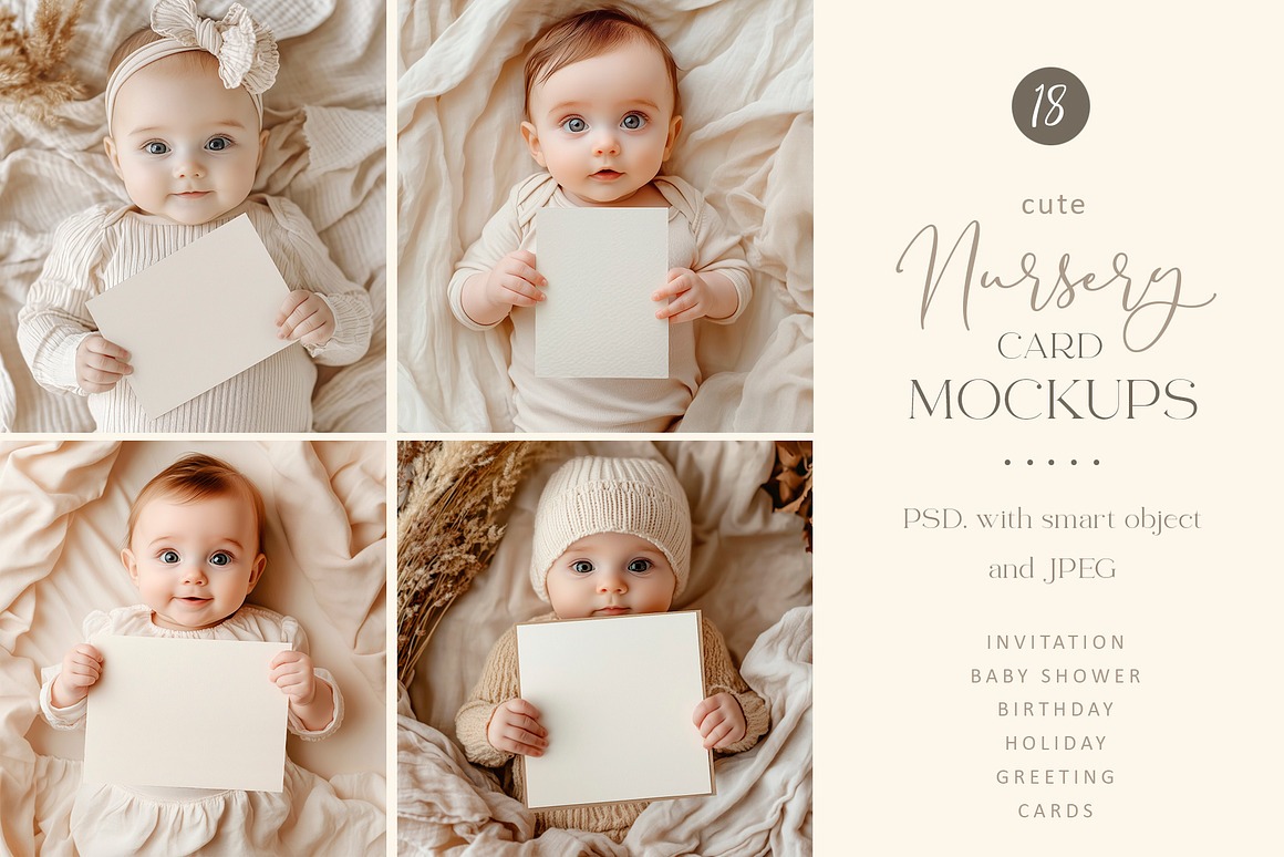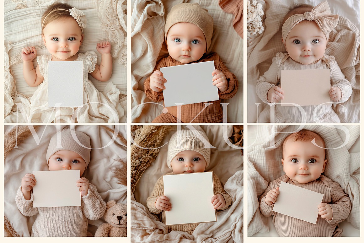 These versatile mockups are perfect for a wide range of occasions – from birthdays, invitations, and baby showers to festive celebrations and kids’ parties. The designs come in soft, natural tones and subtle pastel shades, ensuring your cards remain the focal point while the delightful baby models amplify the mood. Their gentle colors and minimalist style make them the perfect canvas to showcase your cards with sophistication and heart.