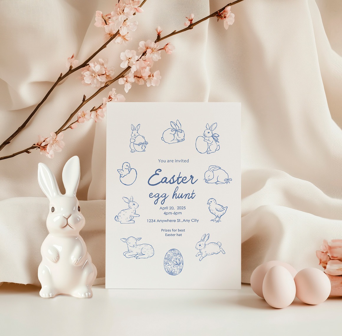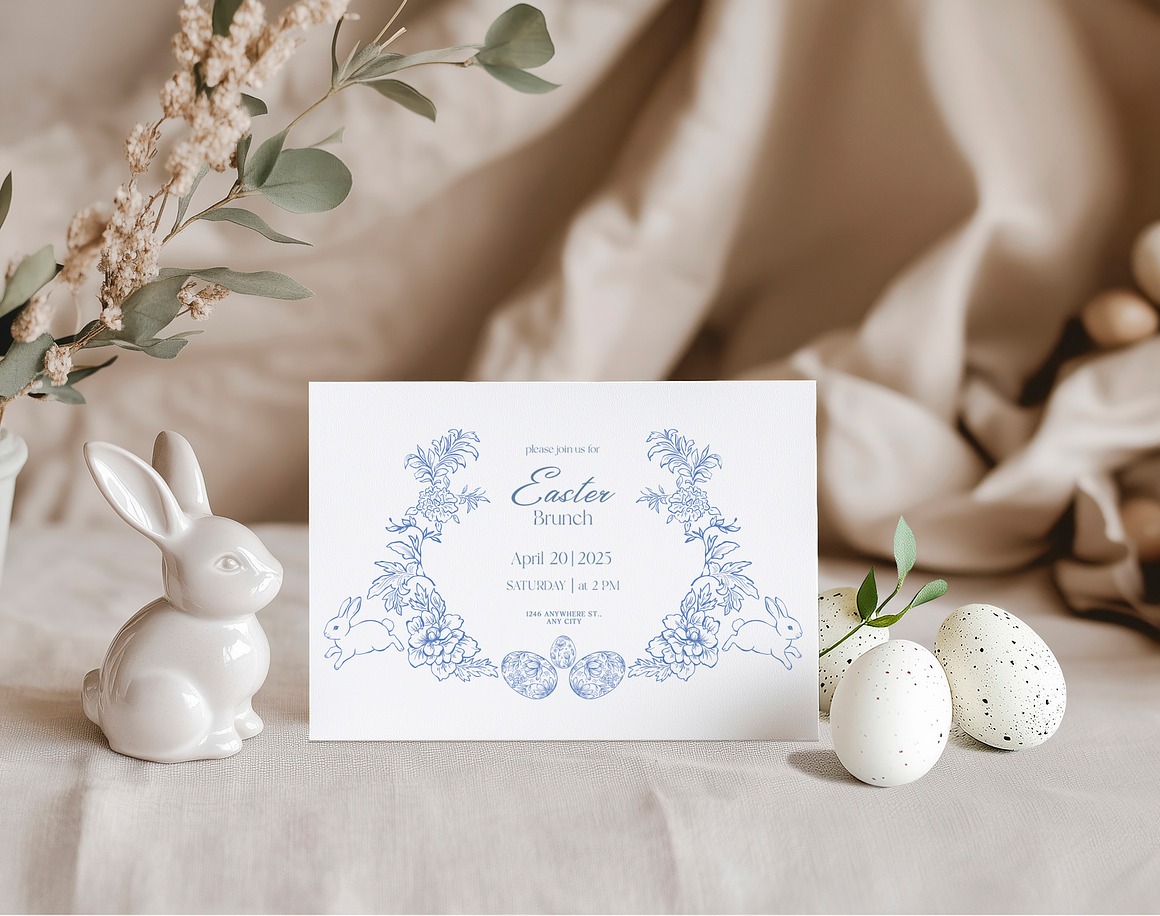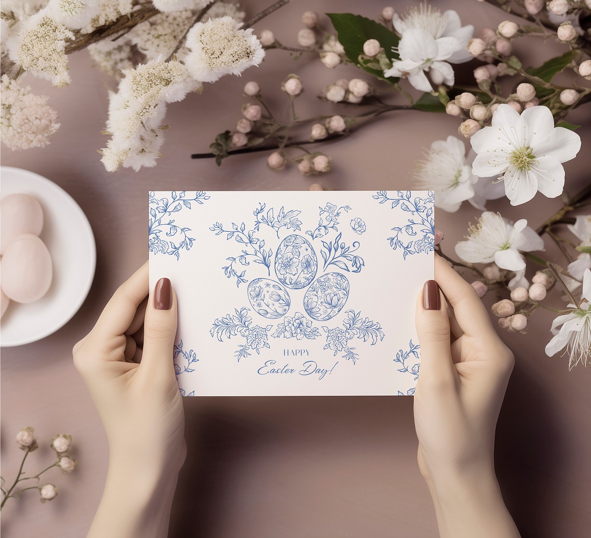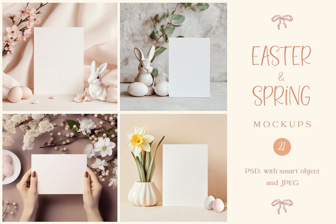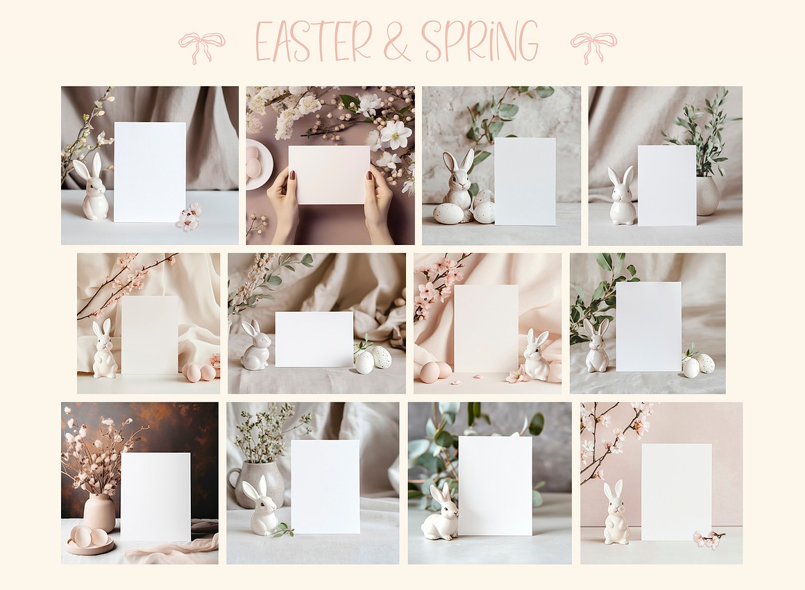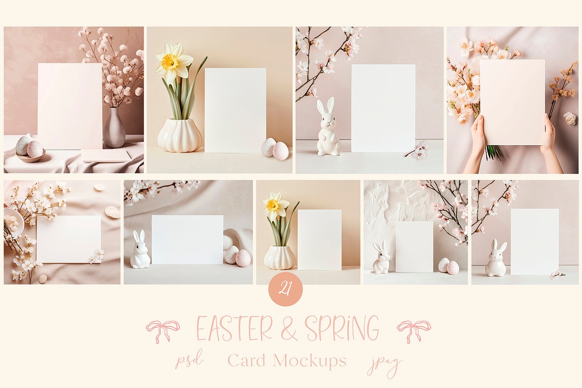 Celebrate Easter and the beauty of Spring with this charming collection of adorable Сard Mockups. Featuring delicate arrangements of cute bunny figurines, decorative eggs, and blooming spring branches, these mockups add warmth and elegance to your designs.