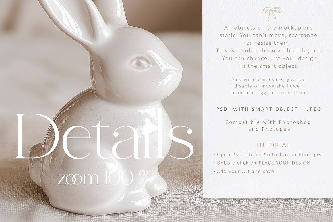 NOTE: All objects on the mockup are static. You can’t move, rearrange or resize them. This is a solid photo with no layers. You can change just your design in the smart object area.