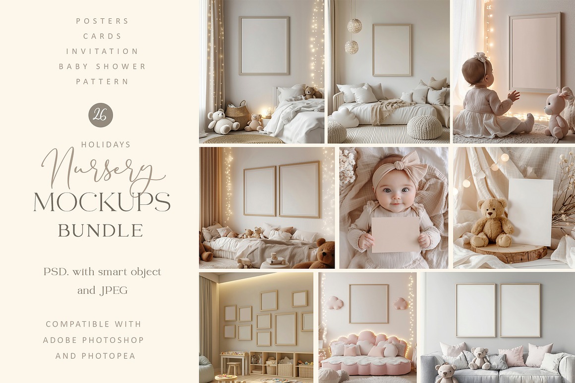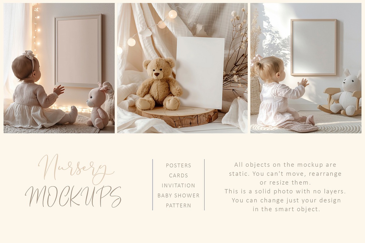 Crafted with versatility in mind, this collection , making it ideal for baby and children rooms, invitations, stationery, greeting cards, holidays, and more. With its soft tones and refined aesthetic, these mockups offer a timeless and elegant canvas for your creative projects.