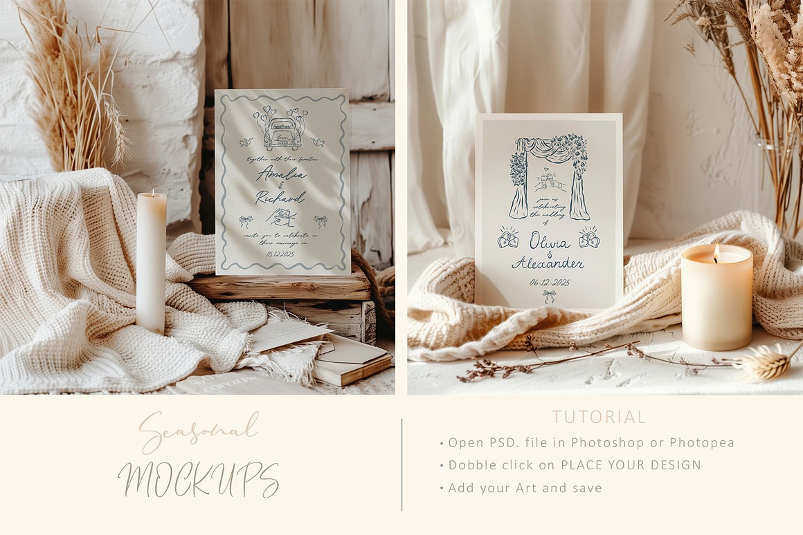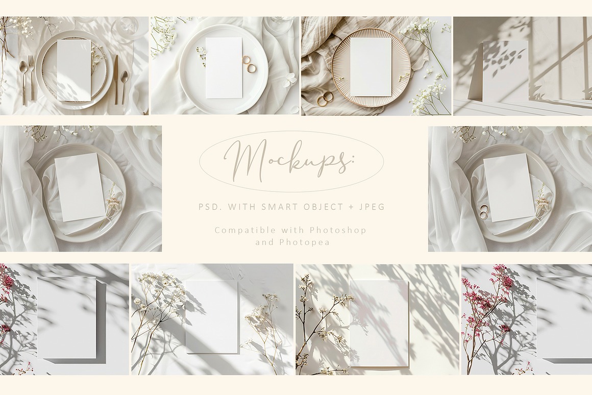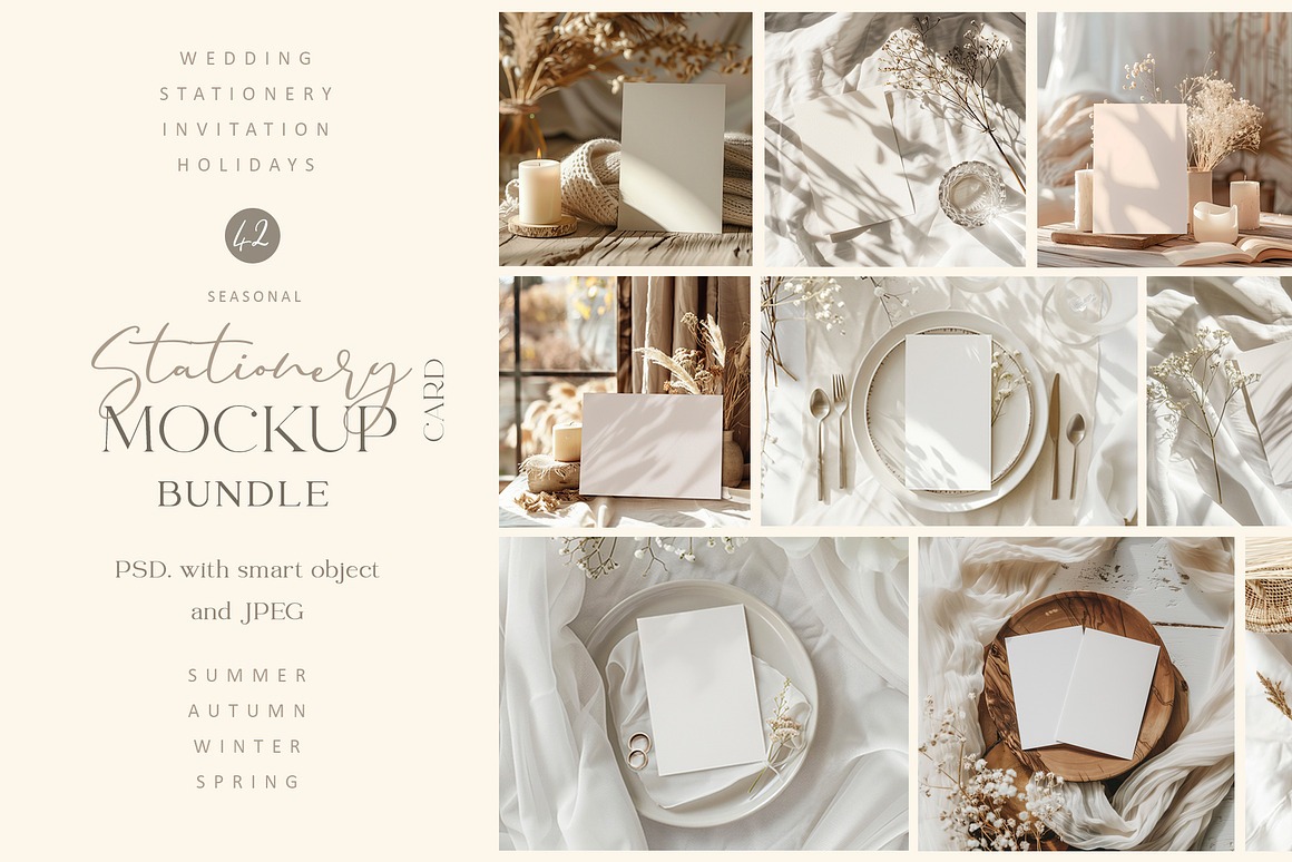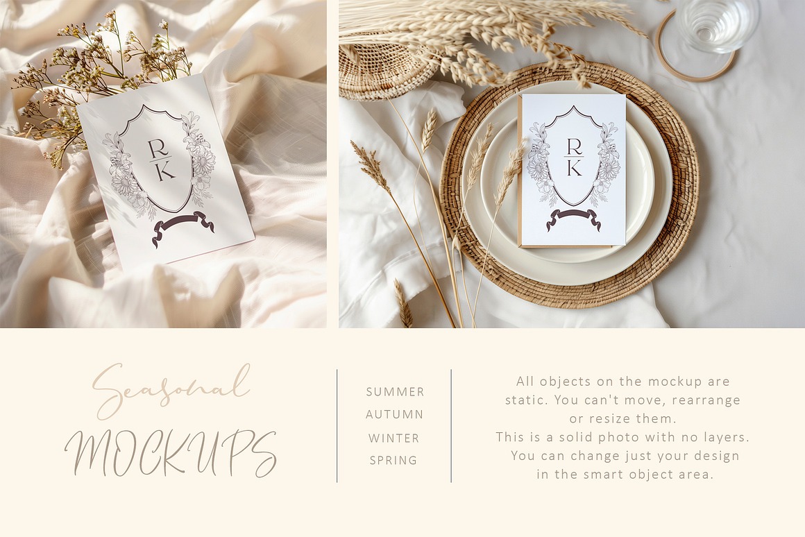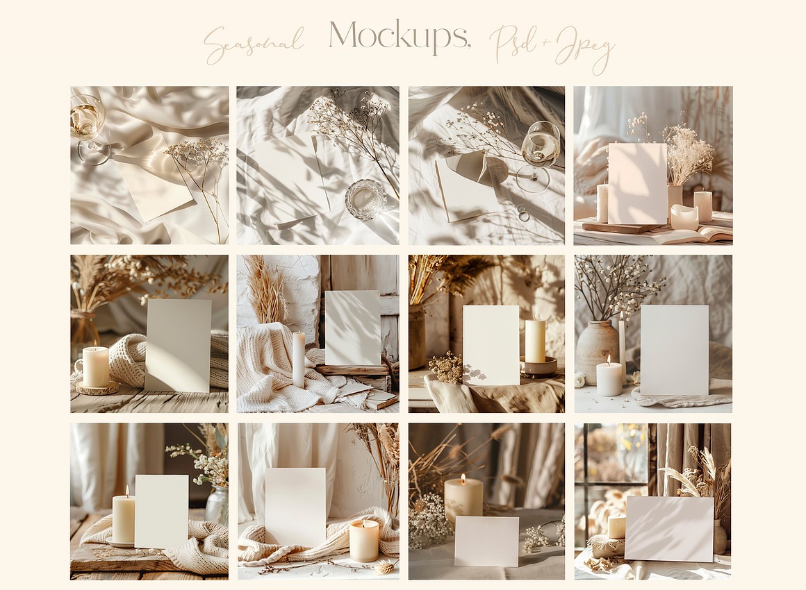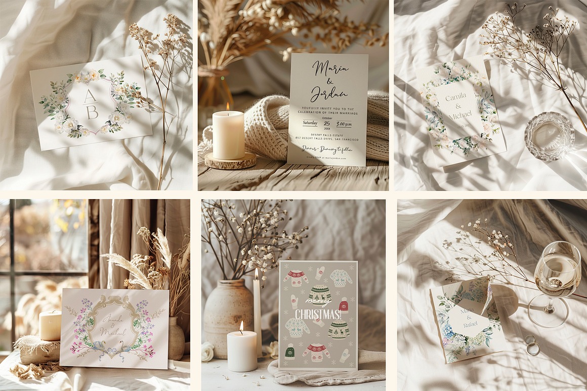 Crafted with versatility in mind, this collection spans all four seasons, making it ideal for weddings, invitations, stationery, greeting cards, holidays, and more. With its soft tones and refined aesthetic, these mockups offer a timeless and elegant canvas for your creative projects.