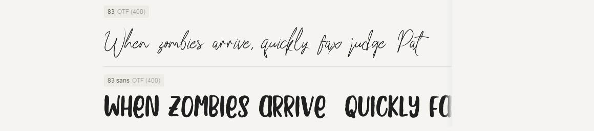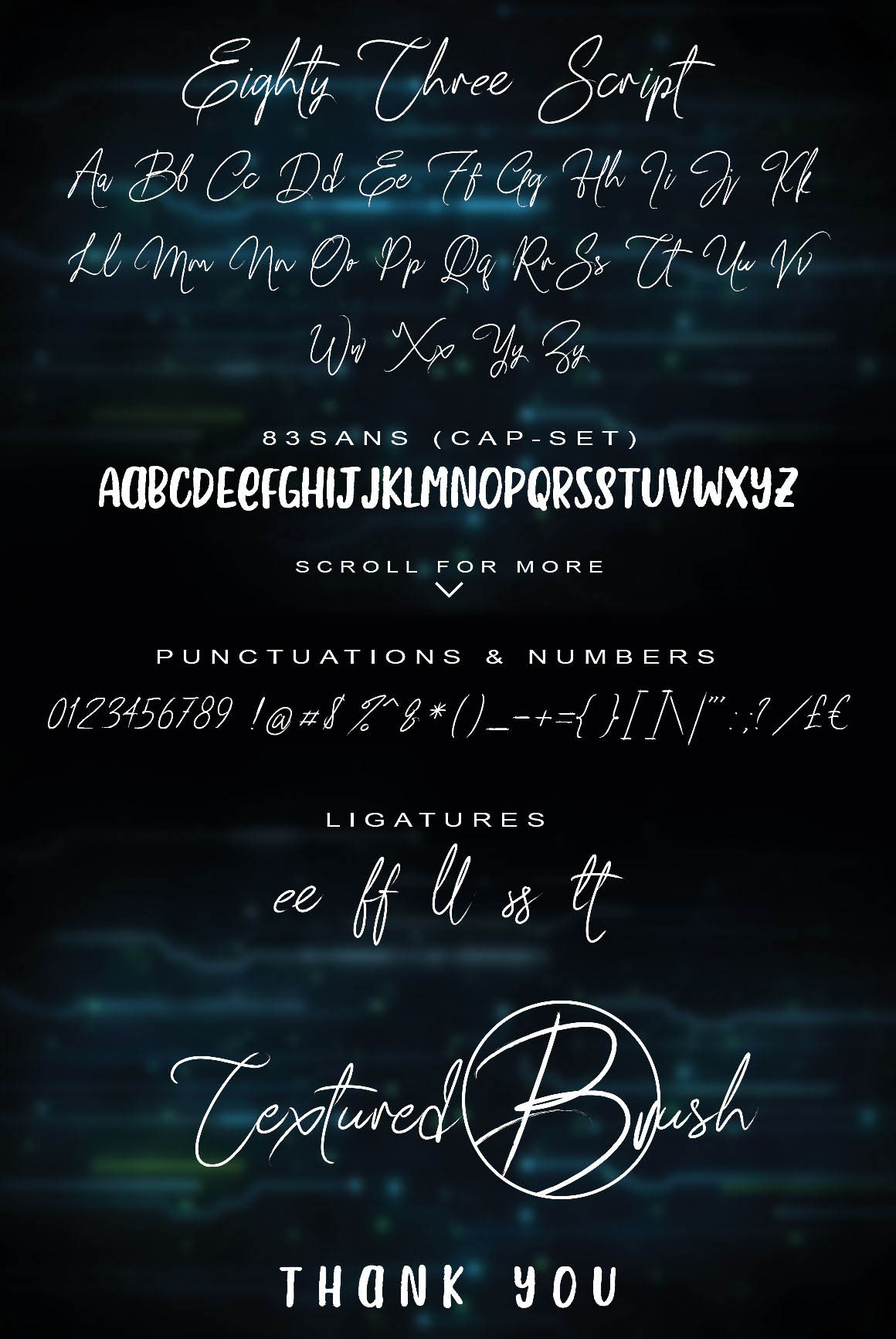 A Clean & Classy signature-style a new font duo with awesome characters! 83 script to make it look even more natural than a standard font, include Ligatures (letters custom). Suitable for Branding, greeting cards, business card, apparel, t-shirt (your name), signature, logo, correspondence, and a variety of other purposes. That’s all good stuff! But what’s included: 1. Eighty Three regular A handwritten script font containing upper & lowercase characters, numerals and a large range of punctuation. 2. Eighty Three sans Perfect for supporting text to compliment the Eighty Three regular font. An all-caps font containing uppercase-only characters.