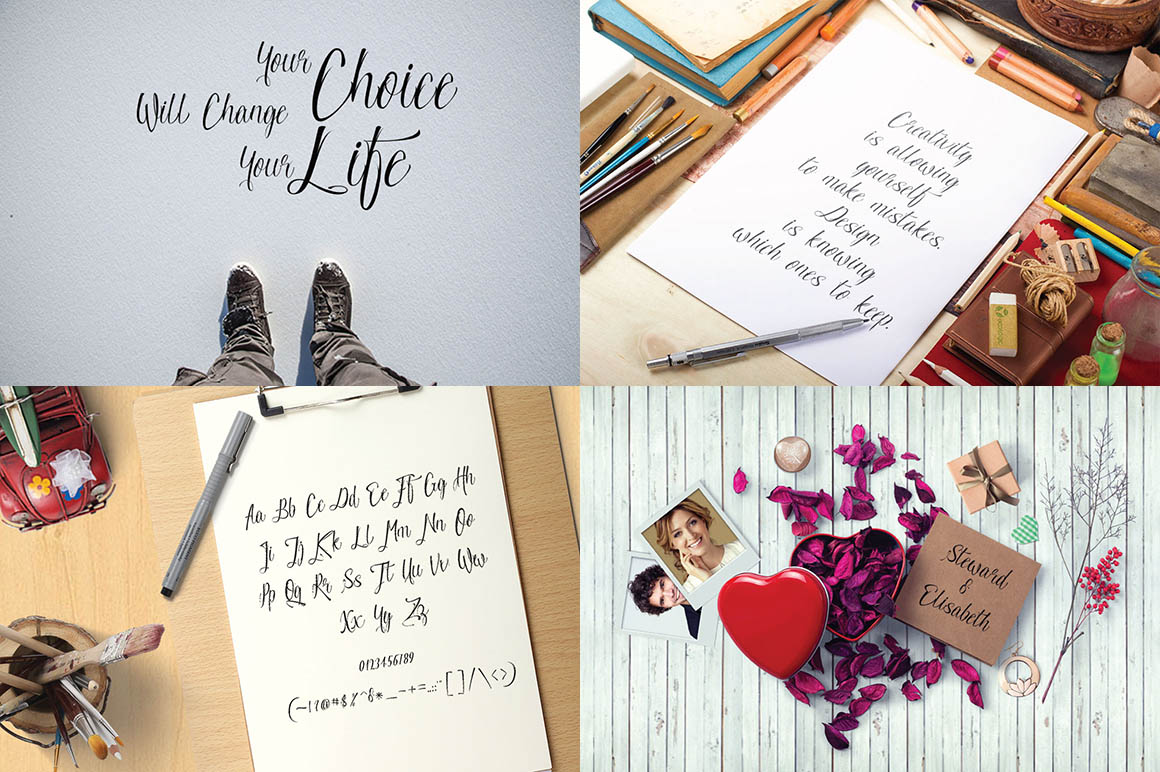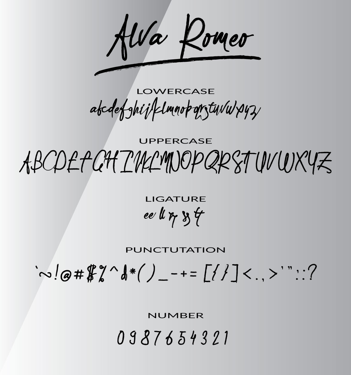 Alva Romeo is an awesome Handwriting typeface. Suitable for wedding invitations, greeting cards, design of water-based paints, signature, logo, correspondence, and a variety of other purposes.