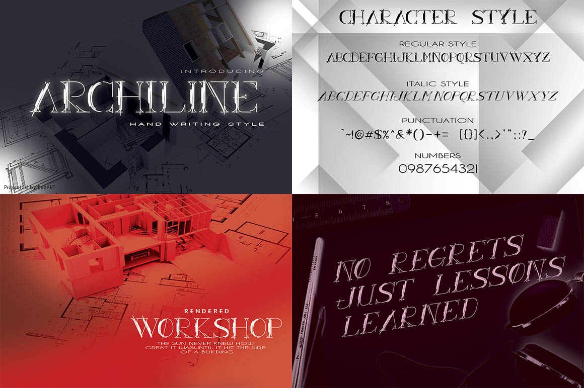 ARCHILINE is an awesome Handwriting Style Display. Suitable for cover design, greeting cards, design of architecture drawing, signature, logo, correspondence, and a variety of other purposes.