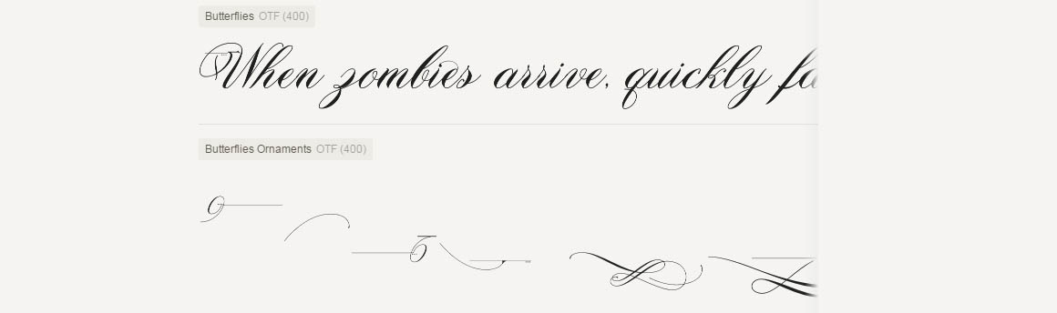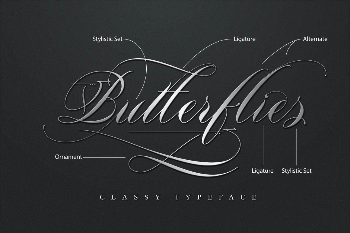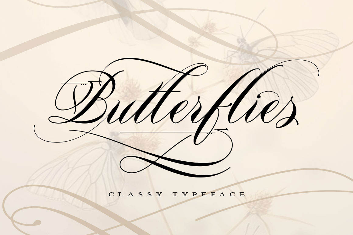 Presenting to you a Butterflies Typeface, a classy and elegant calligraphy, create an early american handwriting look within a second as a professional calligrapher. This font was created with full of love. Every characters and kearning were cared carefully to make sure the natural flow and look of every words or sentences created by Butterflies Typeface. You are welcome to used it for various purpose like wedding invitations, logos, signatures, t-shirts, cards, printed quotes, product packagings, headings, blogs, and many more… More over, you can create many custom dynamic text with lots of alternates, ligatures and ornaments through open type software such as Photoshop, illustrator, indesign, corel draw and more. Butterflies Typeface is also has given PUA unicode and multilingual support (please see preview images no. 10 and 11) Fell free to use it for commercial purposes too…