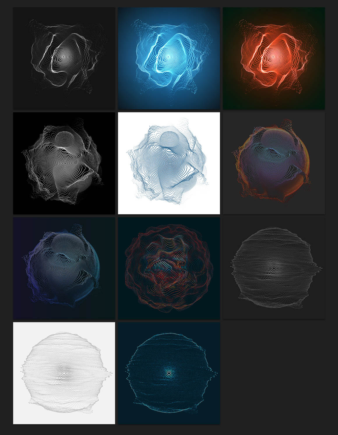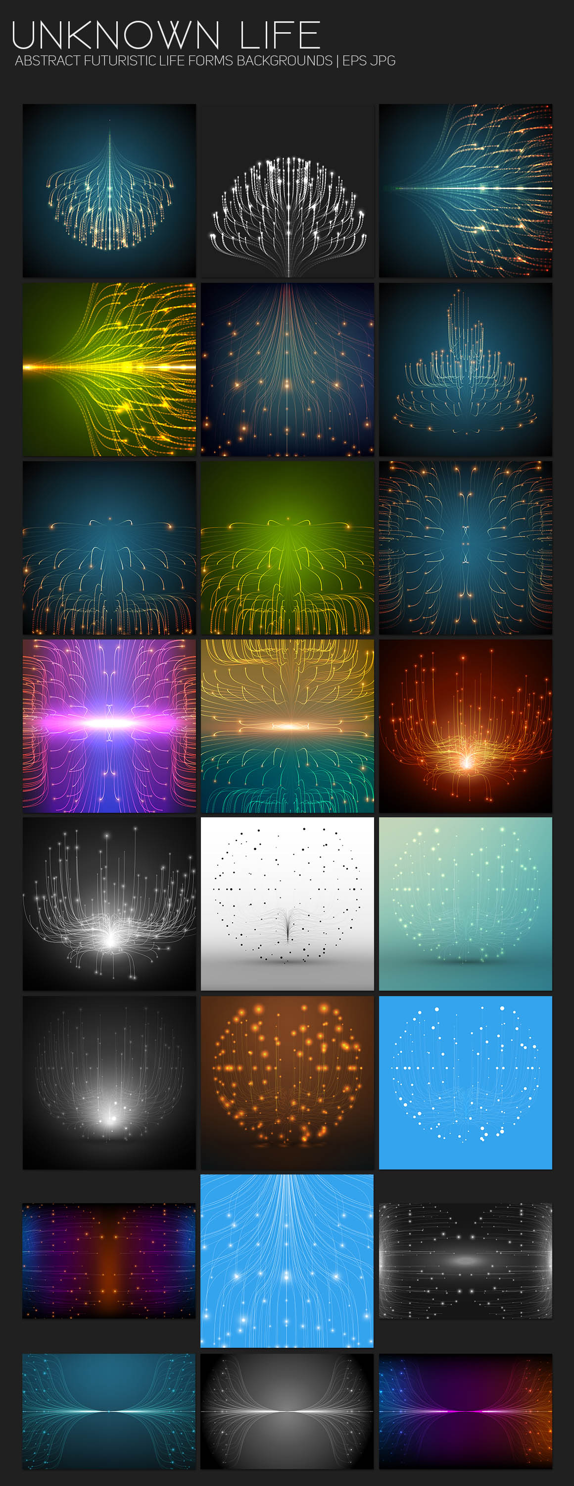 24 Absract Backgrounds with shining points and lines. Neyrons network and connections. Sci-fi living particles. Elegant background for your gift card, etc. ZIP Includes: EPS – vector scalable and layered files & JPG – 5000*5000 raster renders. (in jpegs only backgrounds without sample text on it).