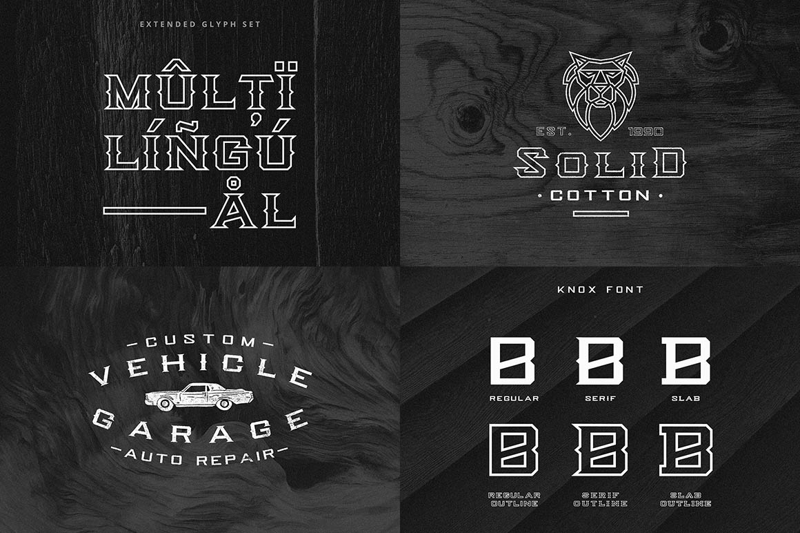 Knox is a 6 font family with a mono weight and different decorations. Inspired by american western culture and tattoos, is perfect to use in vintage-themed designs. Knox is suitable for any project that requires an old western feel as the core design elements; such as logo, wedding invitation, greeting card, poster, etc.