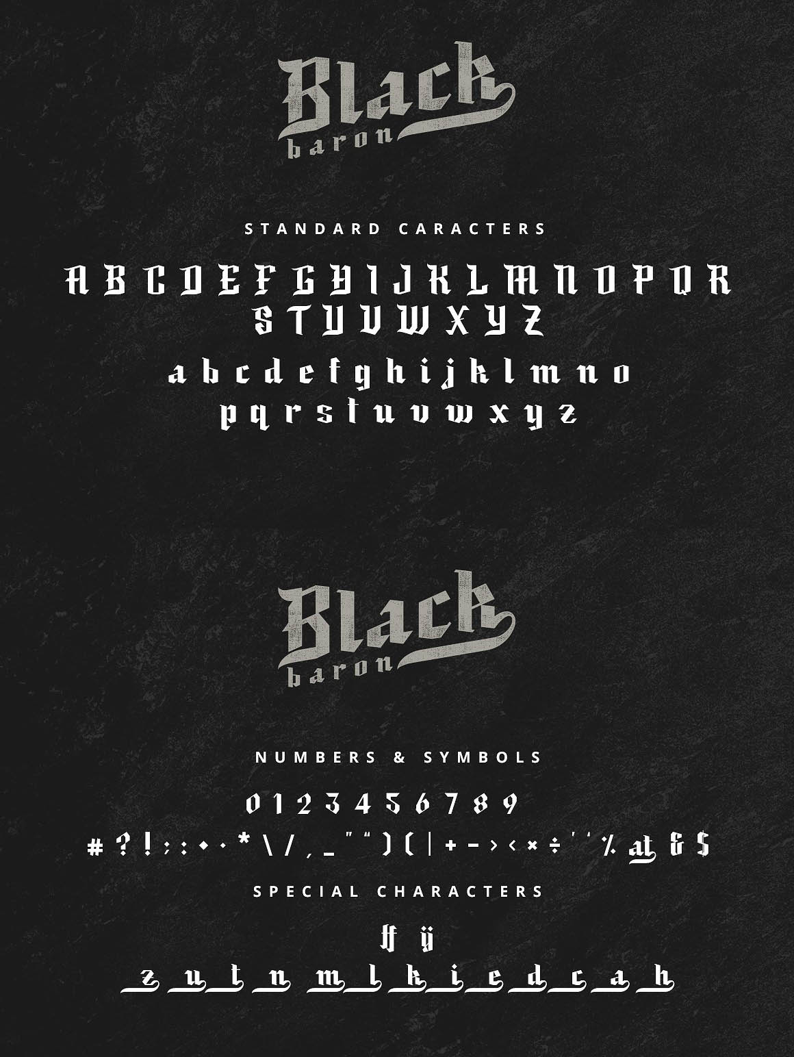 Inspired by medieval script lettering with an air of vintage/retro style. Black Baron is suitable for any project that requires a medieval feel such as logo, wedding invitation, greeting card, poster, etc.