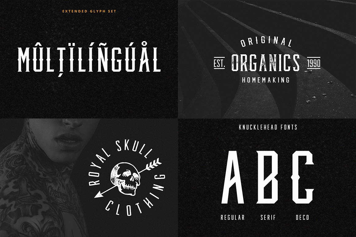 CInspired by american western culture and tattoos, is perfect to use in vintage-themed designs. Knucklehead is suitable for any project that requires an old western feel as the core design elements; such as logo, wedding invitation, greeting card, poster, etc.