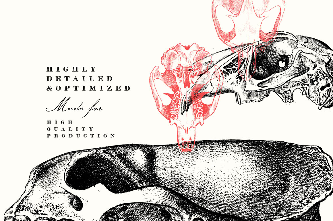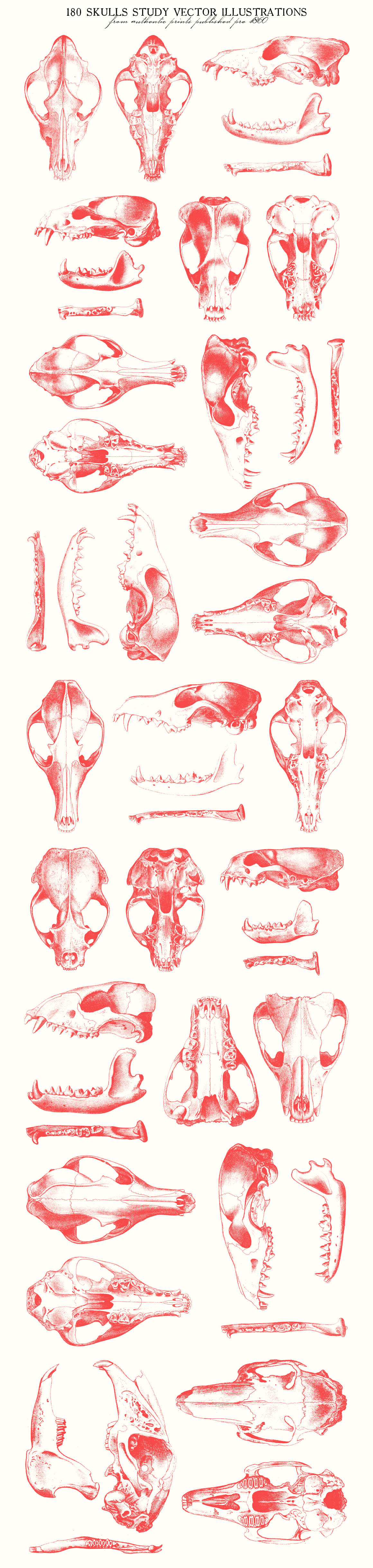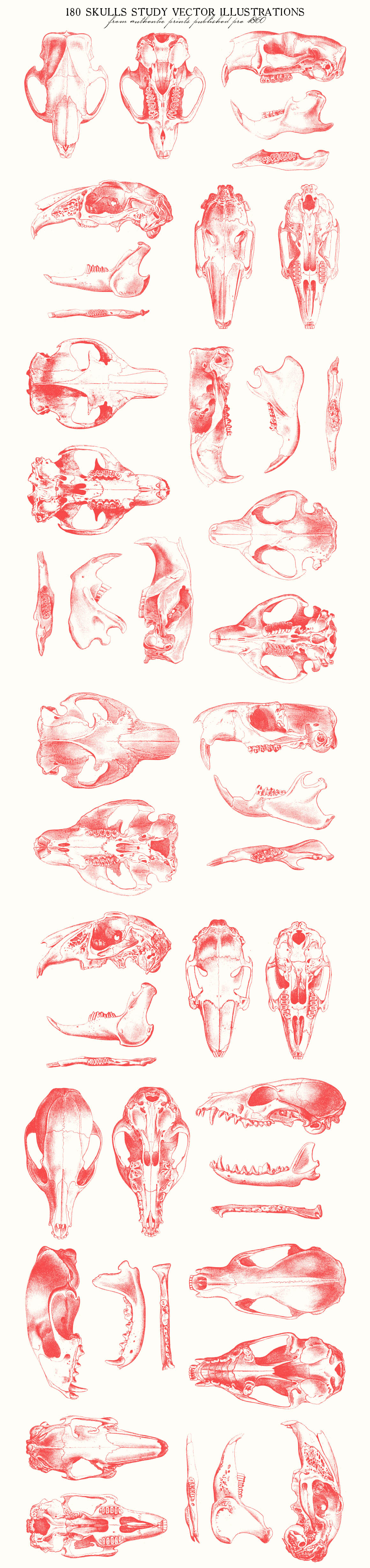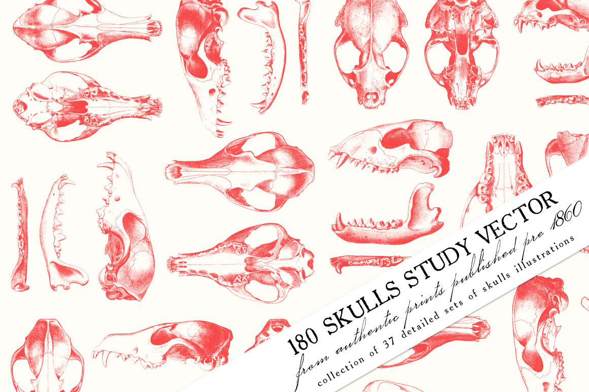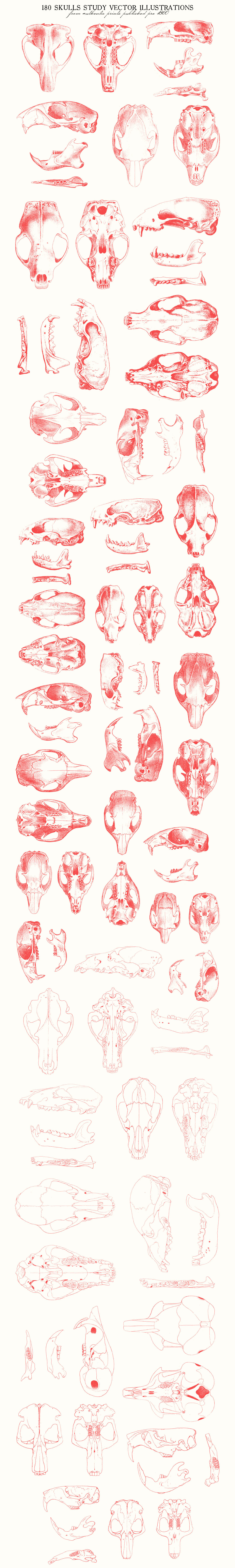This is a beautiful set of 180 skulls study vector illustrations, sourced from authentic prints published pre- 1860, in United States.