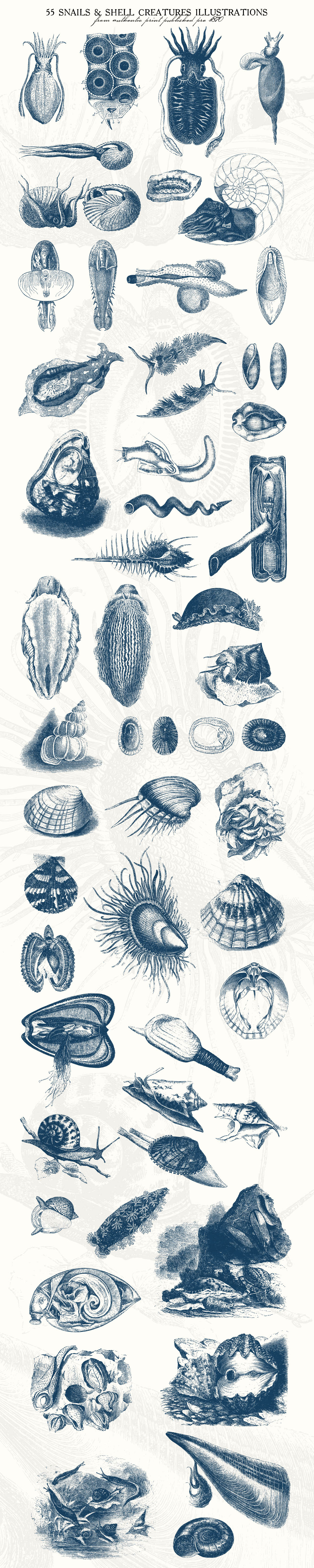 This is a beautiful set of 55 vintage genuine snails and shell creatures illustrations, sourced from authentic print published pre 1870.