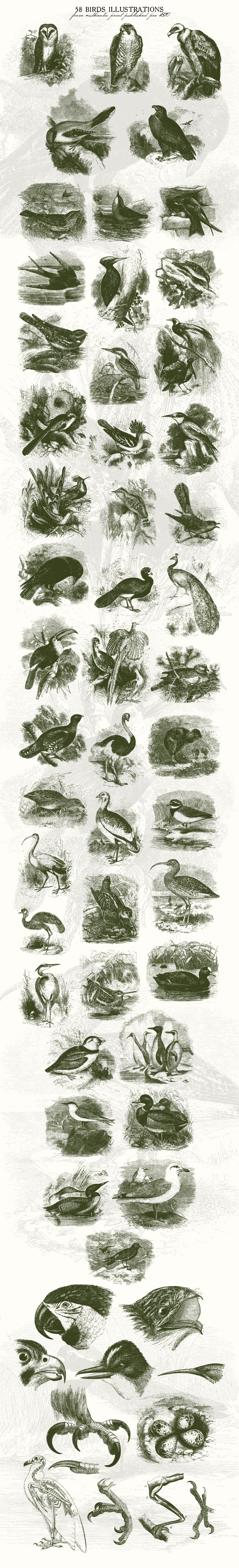This is a beautiful set of 58 vintage genuine birds illustrations, sourced from authentic print published pre 1870.