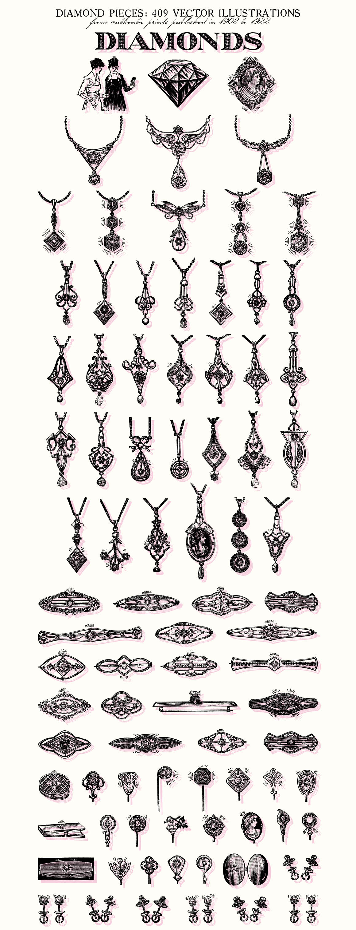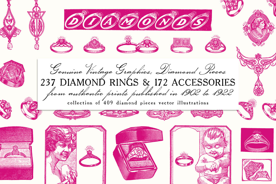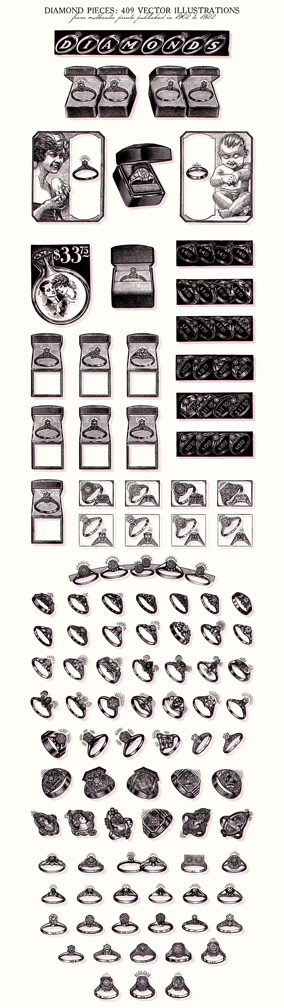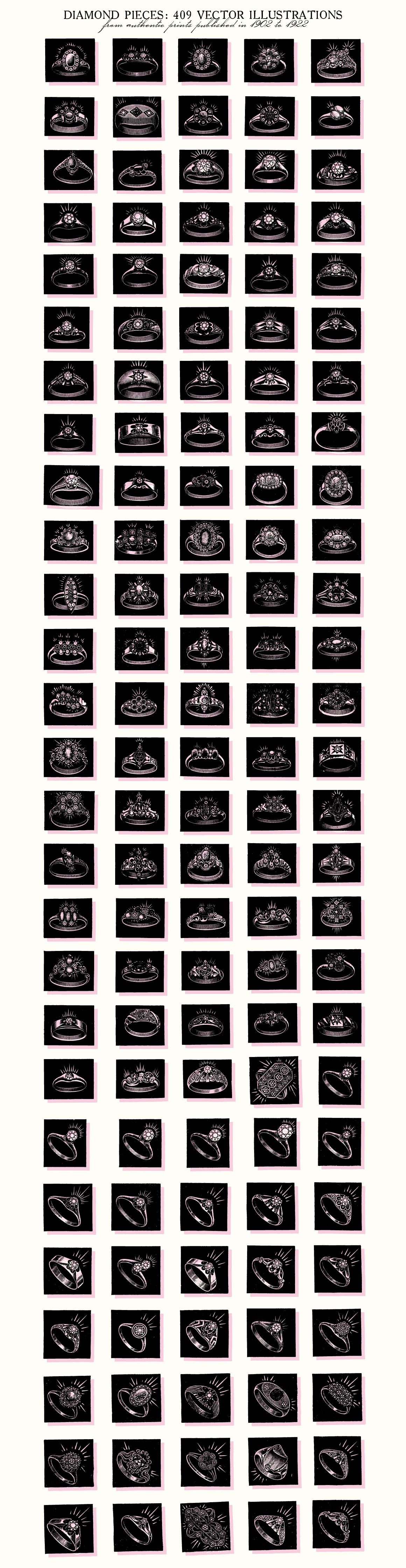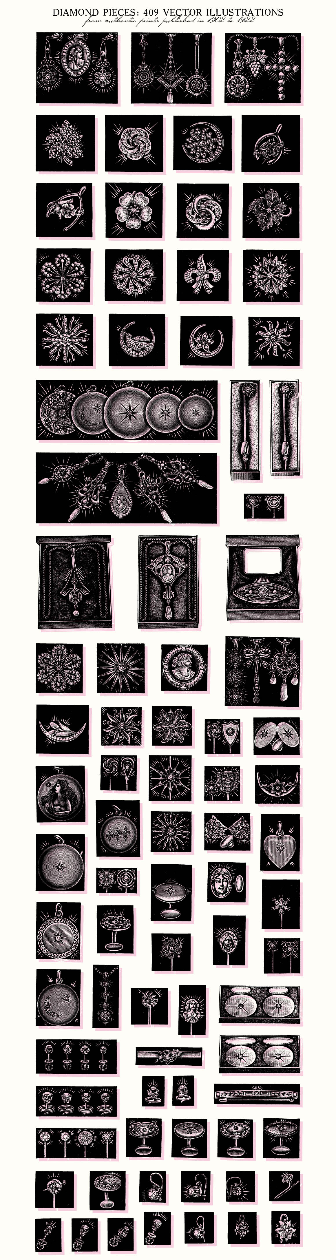 This is a extensive set of 409 vintage genuine diamond pieces vector illustrations, sourced from authentic prints published in 1902-1922, in United States.