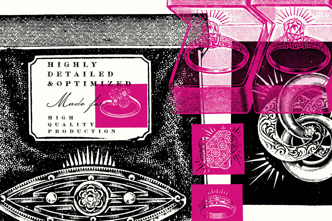 - 409 illustrations include: 237 beautiful diamond rings and 172 diamond accessories including cuff buttons, lockets, brooches, scarf pins, studs, ear screws, pendants etc. Preview 4 – 6 show all included illustrations.