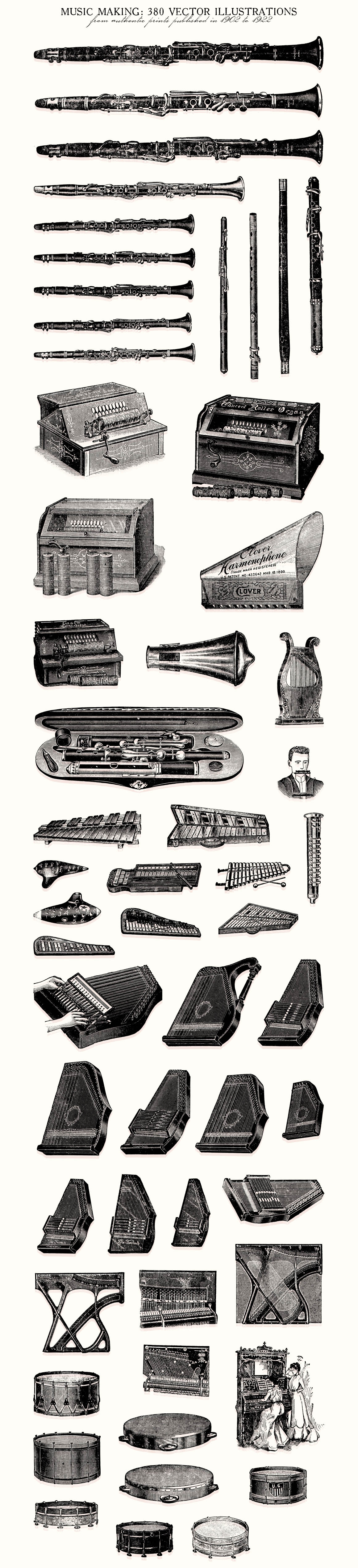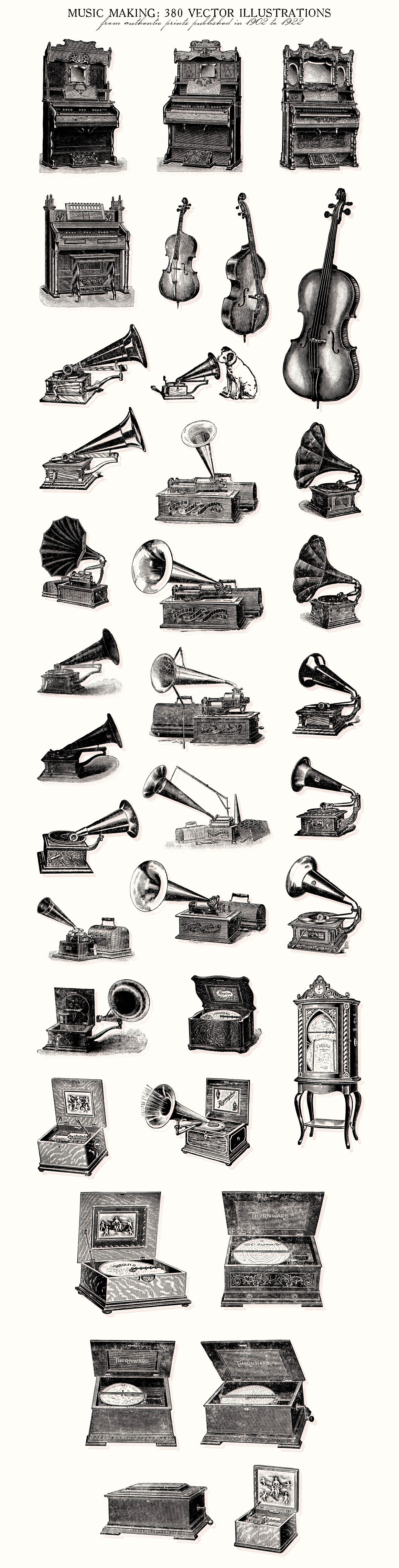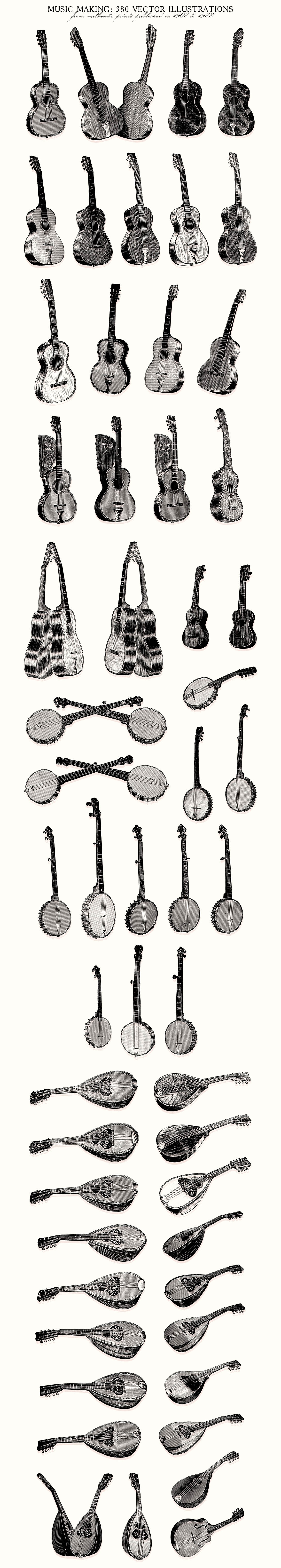 - 380 illustrations include: Violin, harmonica, accordian, violoncello, guitar, ukulele, banjos, phonographs, music box, piano, mandolin, musical instrument parts etc. Preview 4-11 show all included illustrations.