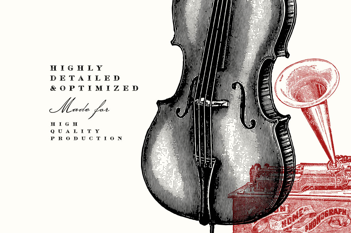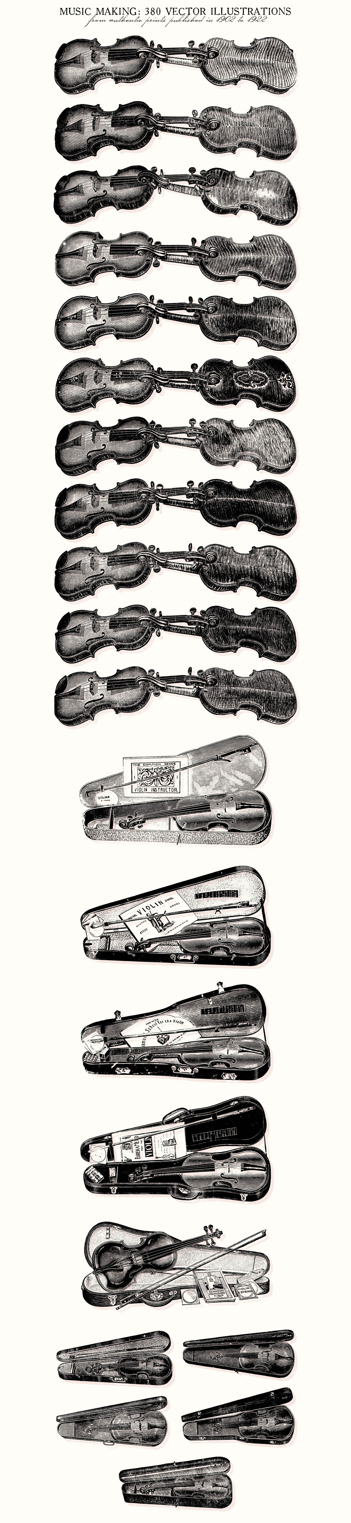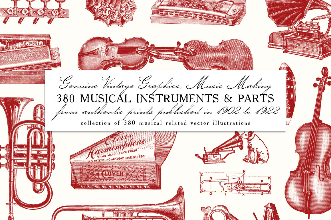 - 380 illustrations include: Violin, harmonica, accordian, violoncello, guitar, ukulele, banjos, phonographs, music box, piano, mandolin, musical instrument parts etc. Preview 4-11 show all included illustrations.