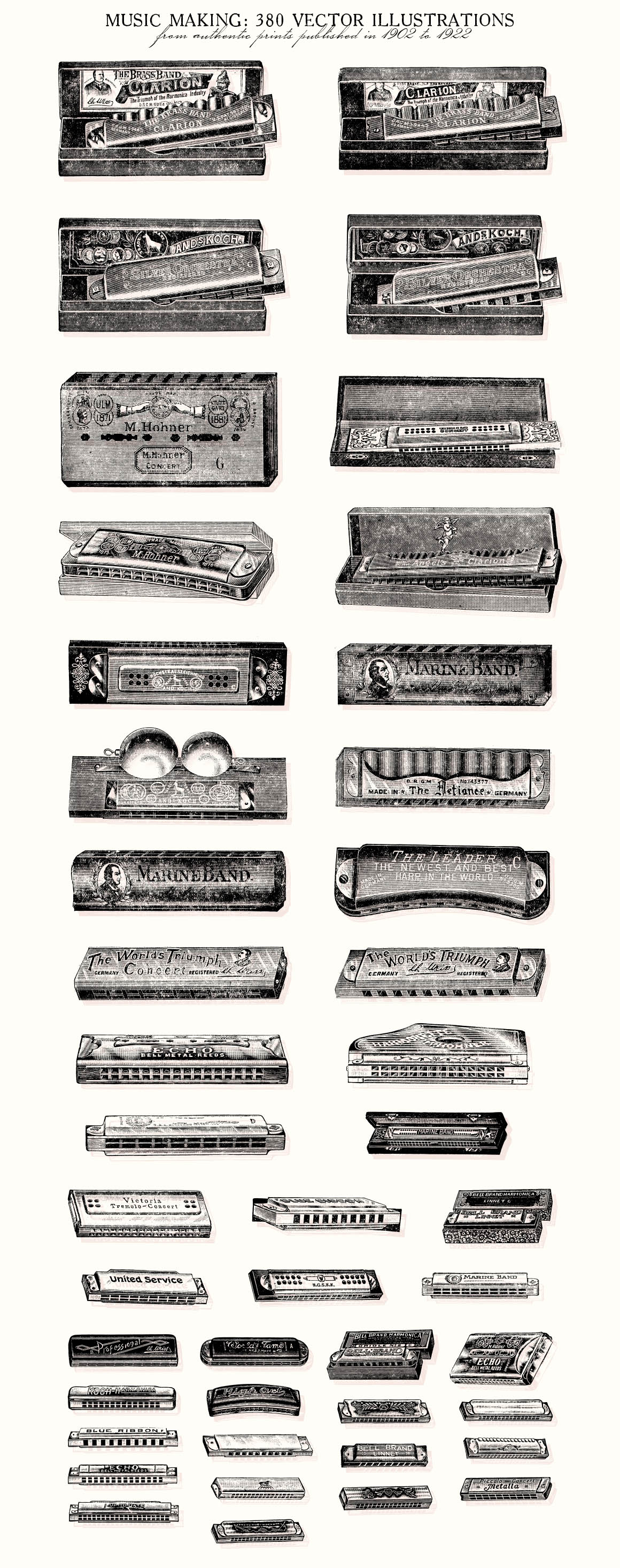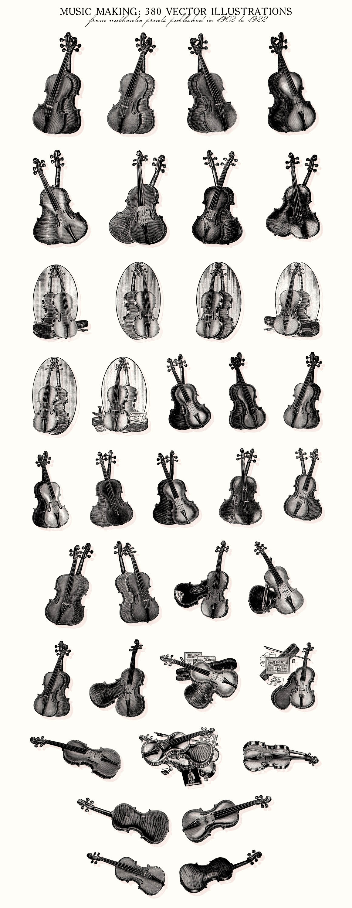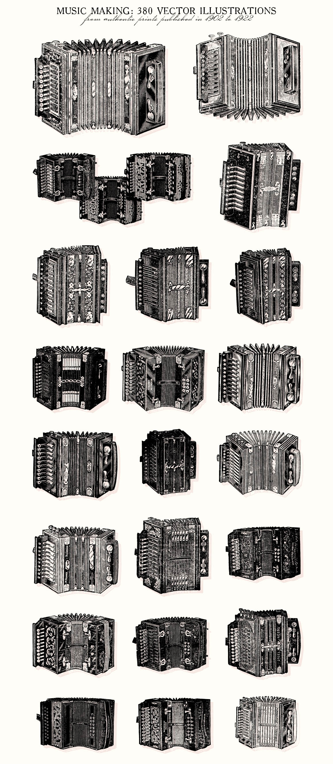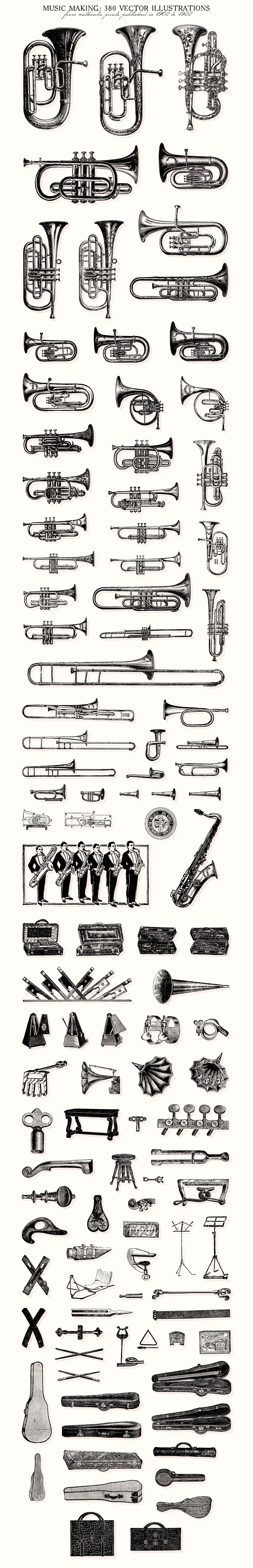 This is a extensive set of 380 vintage musical related vector illustrations, sourced from authentic prints published in 1902-1922, in United States.
