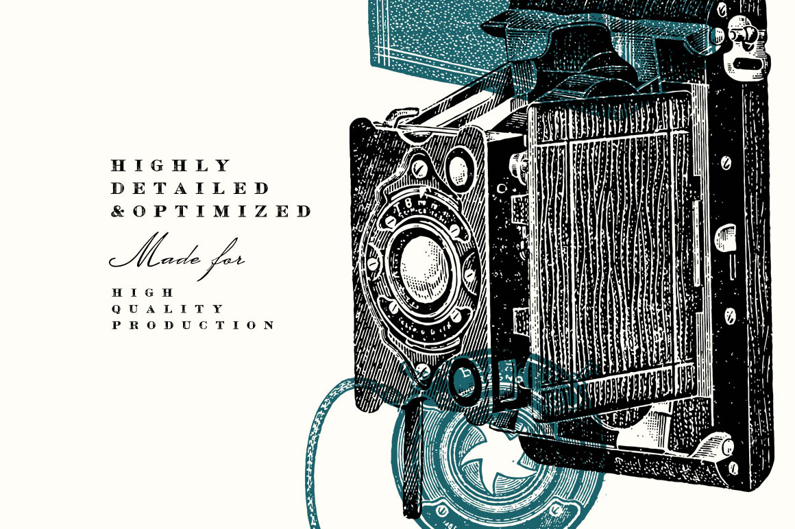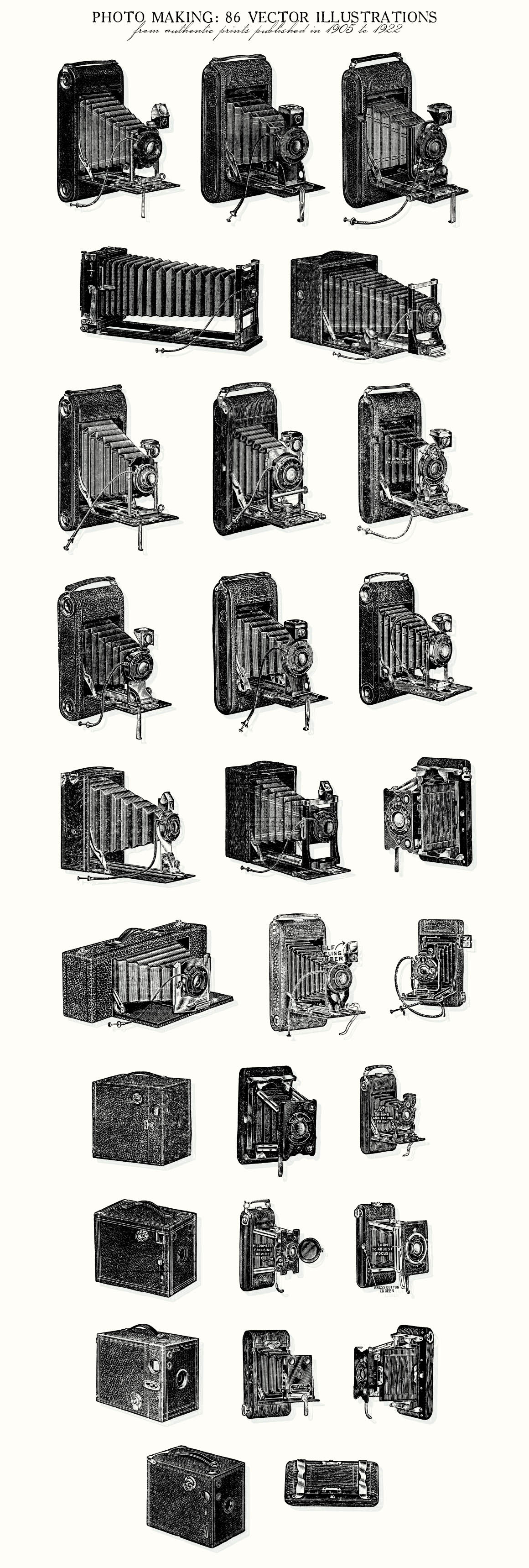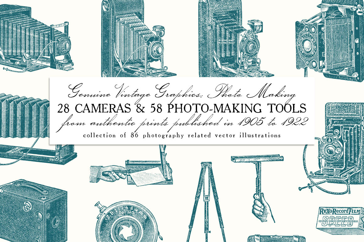 This is a gorgeous set of 28 vintage cameras and 58 photography related vector illustrations, sourced from authentic prints published in 1905-1922, in United States.