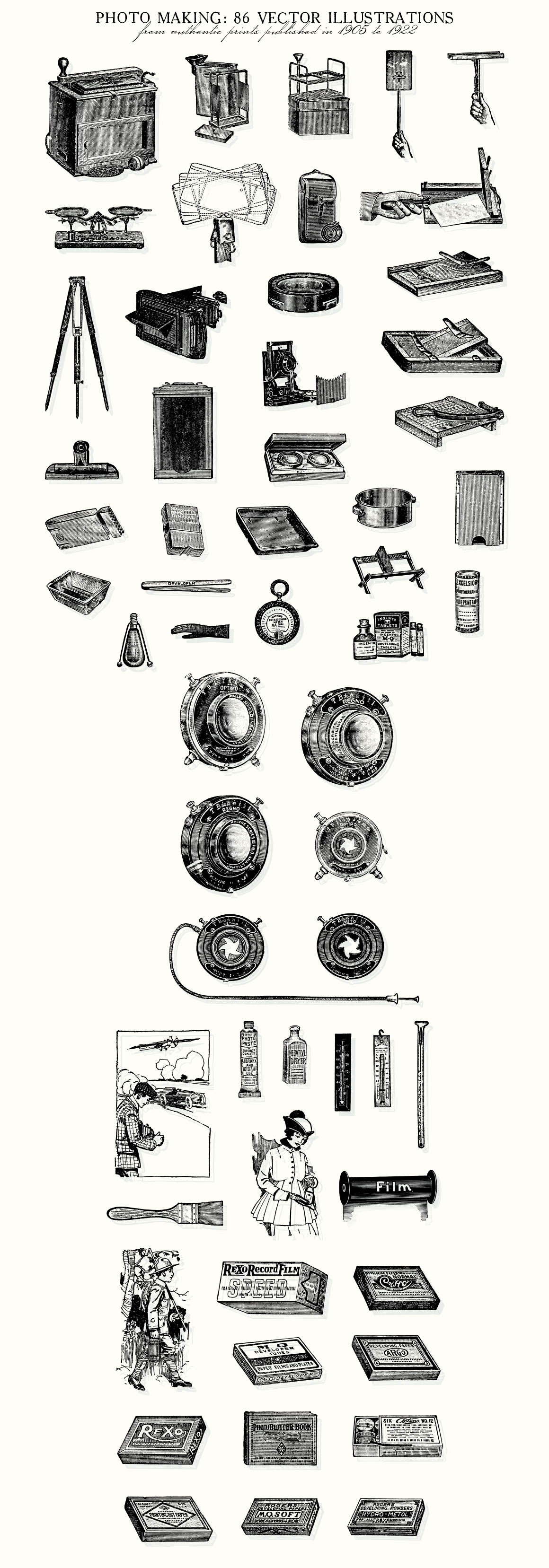 - 86 illustrations include: 28 vintage cameras and 58 photo making items including lenses, film clips, photo trimming board, developing paper and film, developing trays, exposure meter, camera clamp, flash lamp, negative dryer, film pack adapter, ruby lamp (for dark room), professional photographer’s scale, etc. Preview 4 and 5 show all included illustrations.