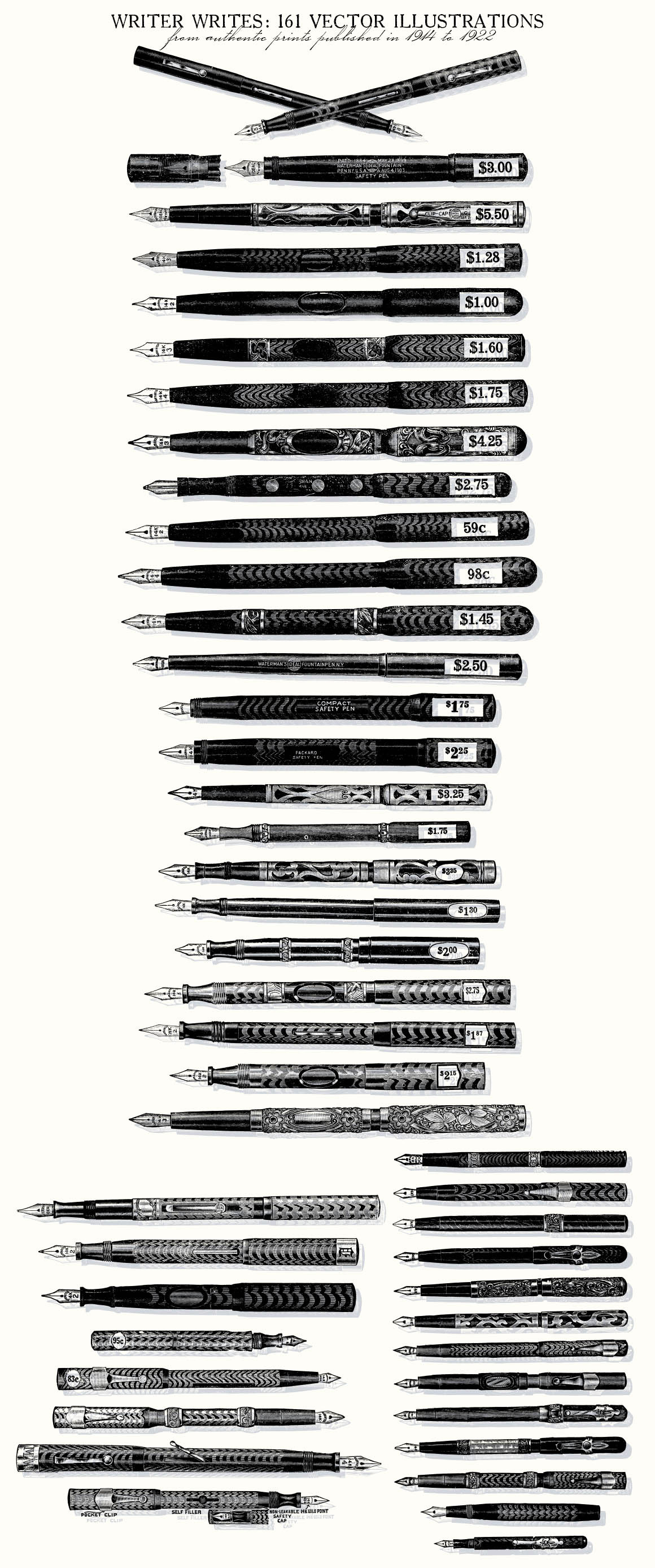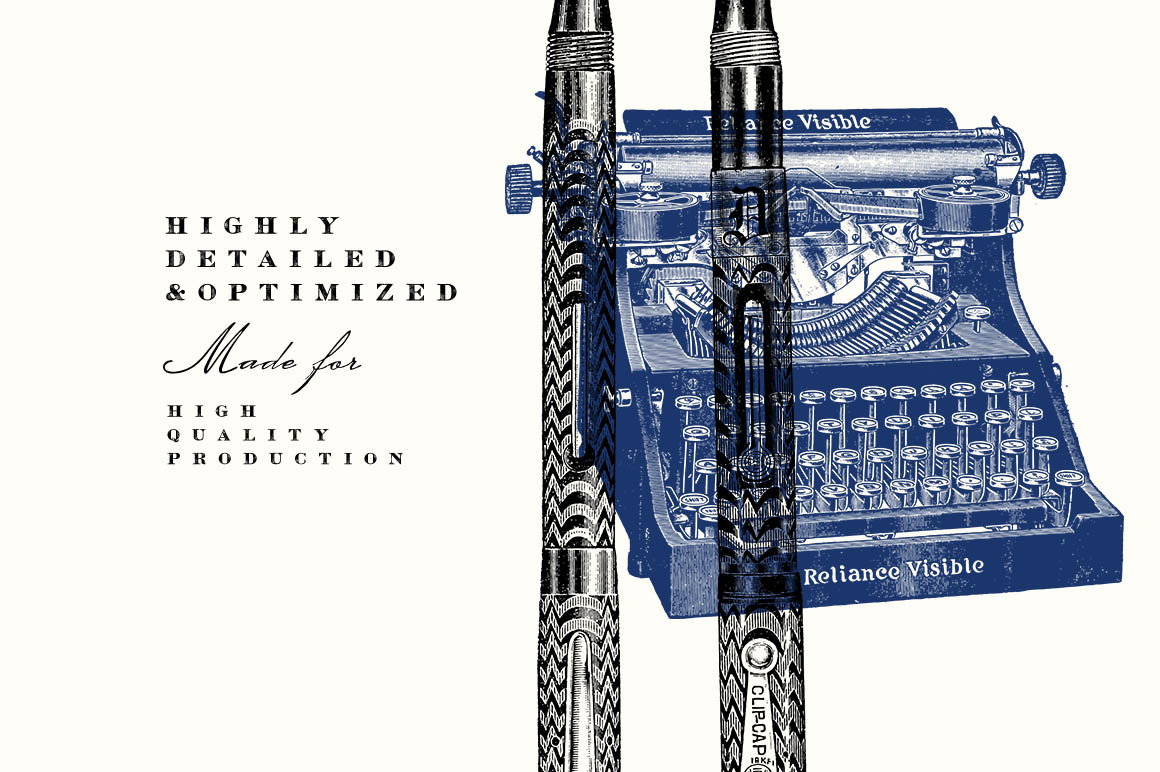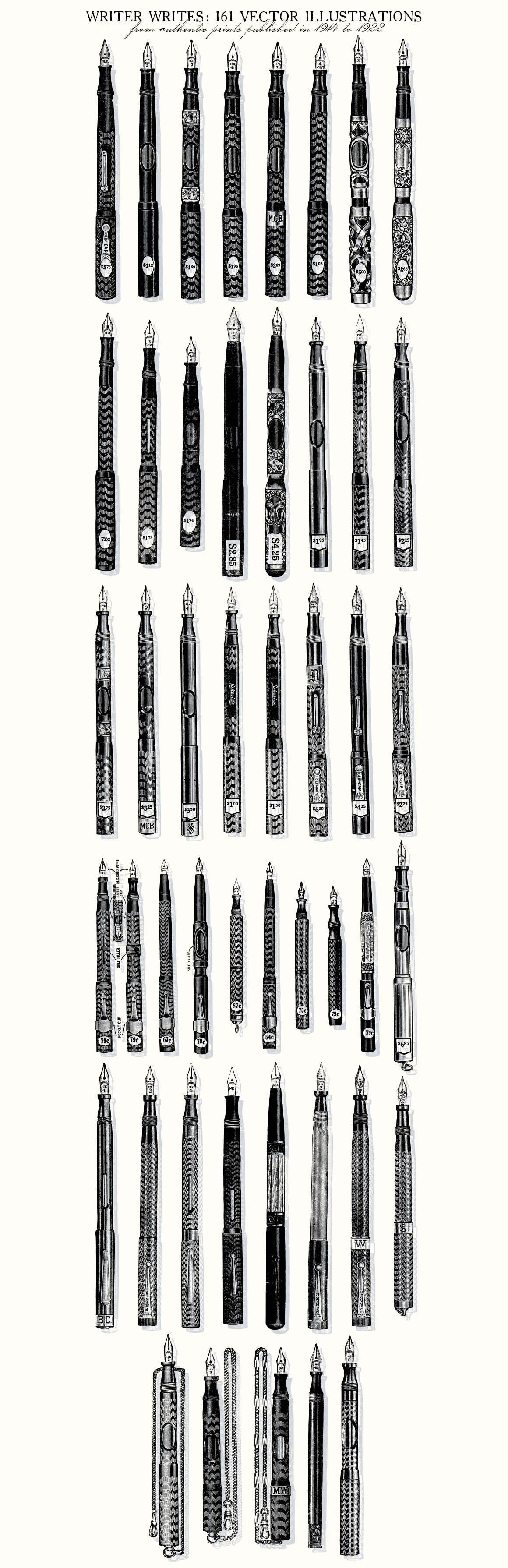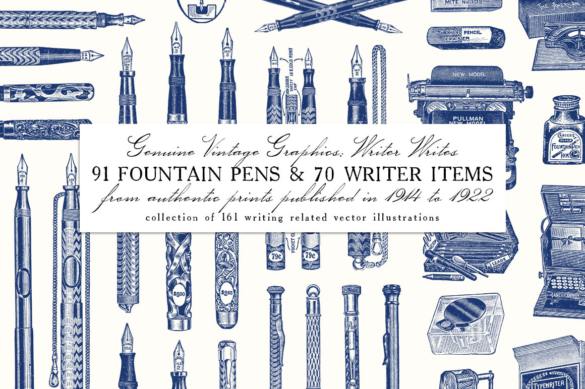 - 161 illustrations include: 91 fountain pens and 70 writer items including few typewriters, pencil, nibs, etc. Preview 4, 5 and 6 show all included illustrations.