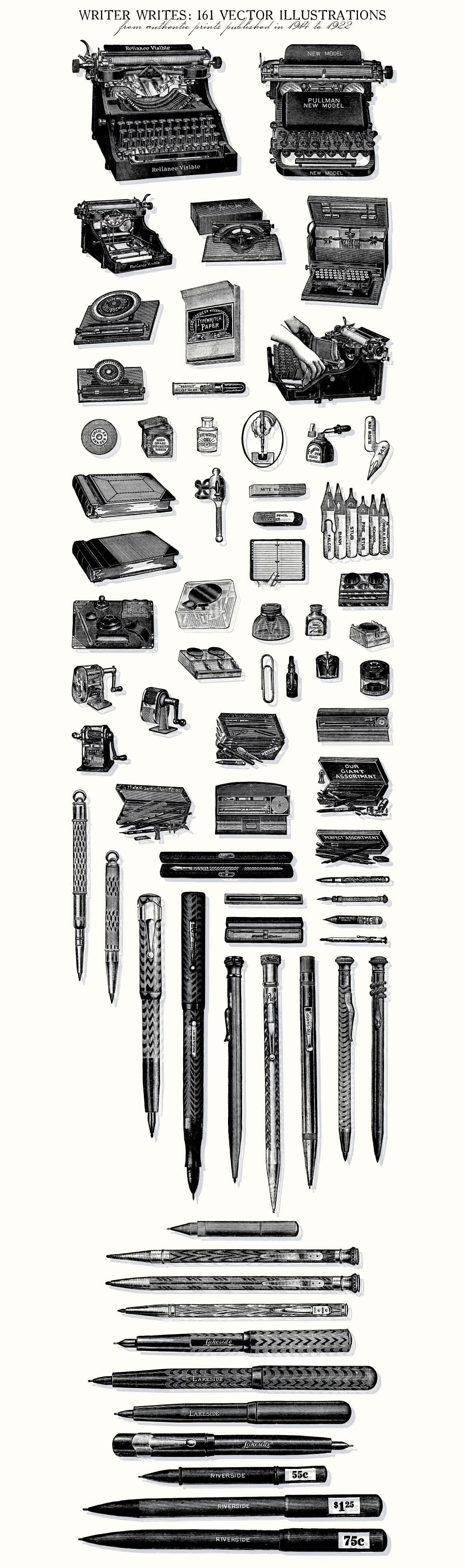 This is an extensive set of 161 writing related vector illustrations, sourced from authentic prints published in 1914-1922, in United States.