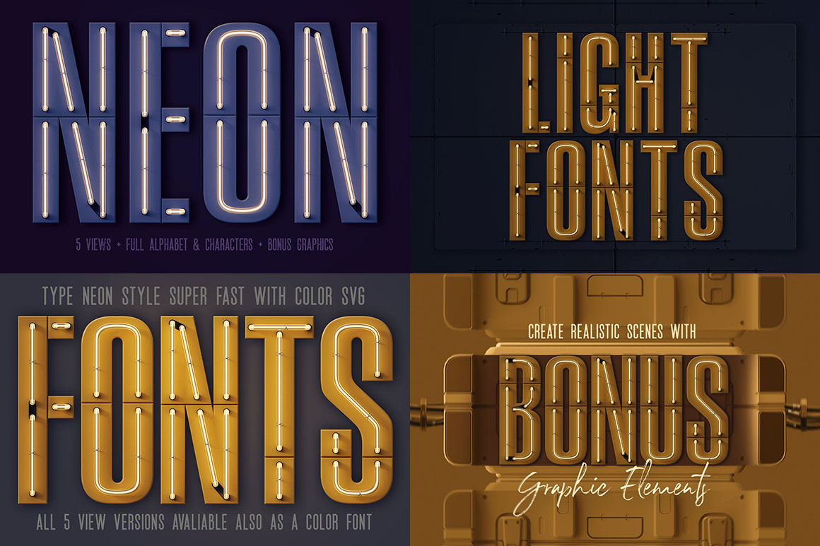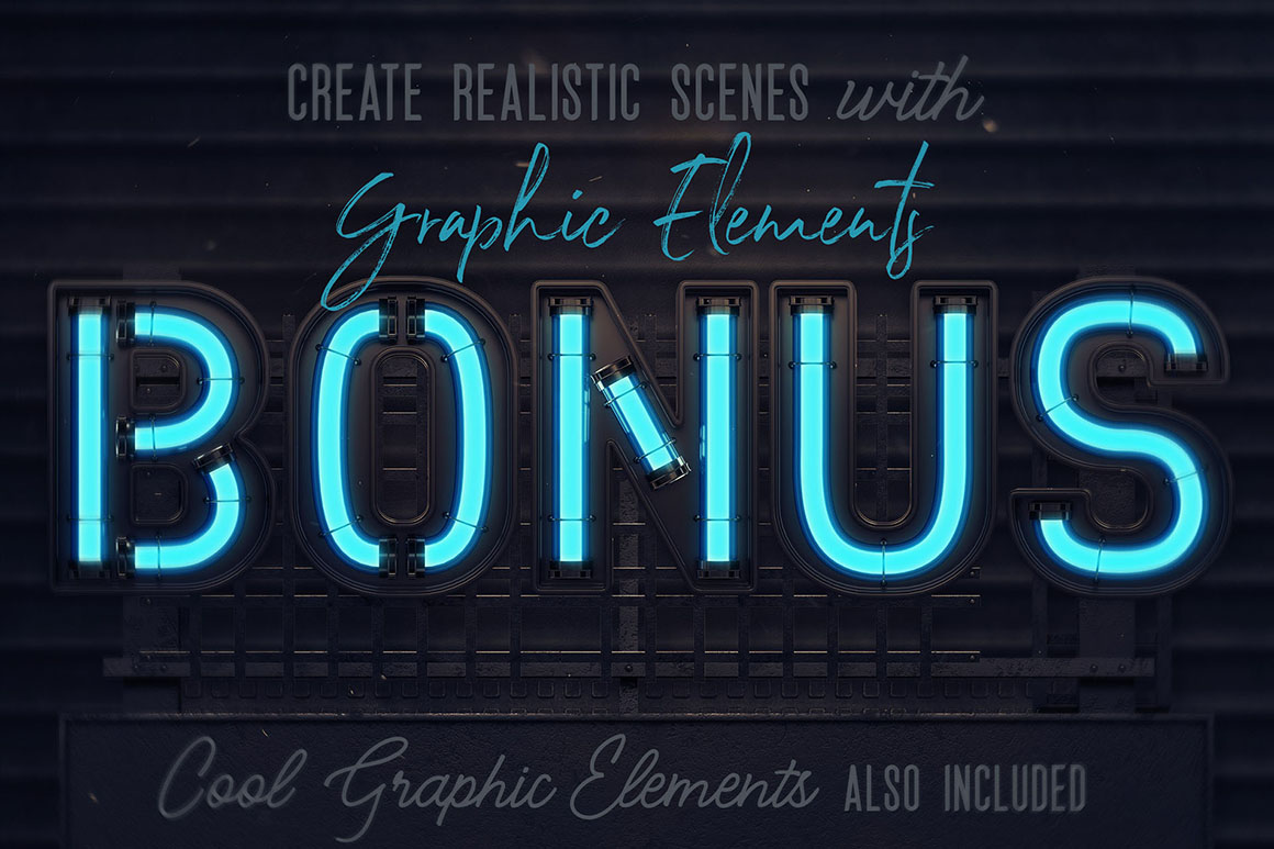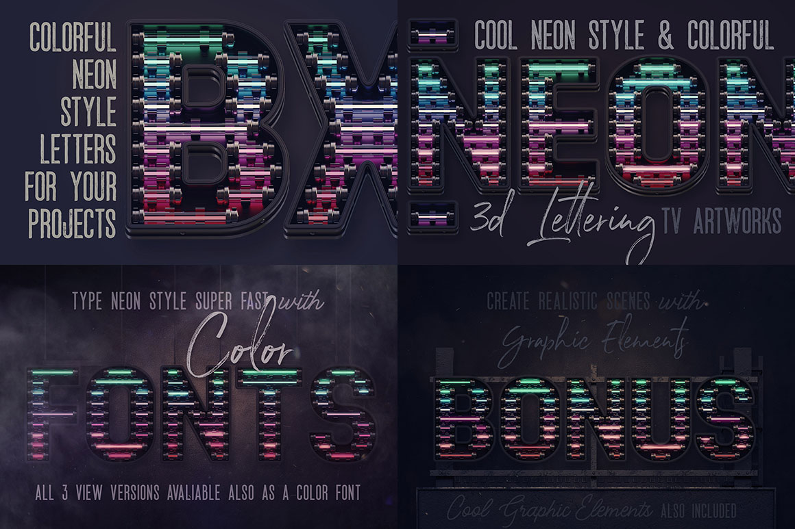 If you are looking for some realistic neon style lettering & graphic ellements then you are at the right place because here you will get a great set of 3D style letterings, fonts & elements for your new artistic projects. You’ll find here 7 lettering sets & color fonts (light on & off, color versions, top light layer & secondary font), graphic elements, 2 regular fonts, backgrounds & scenes… These graphics are in hi-res transparent PNG or layered PSD formats so all are great for your new web design or any print design projects.