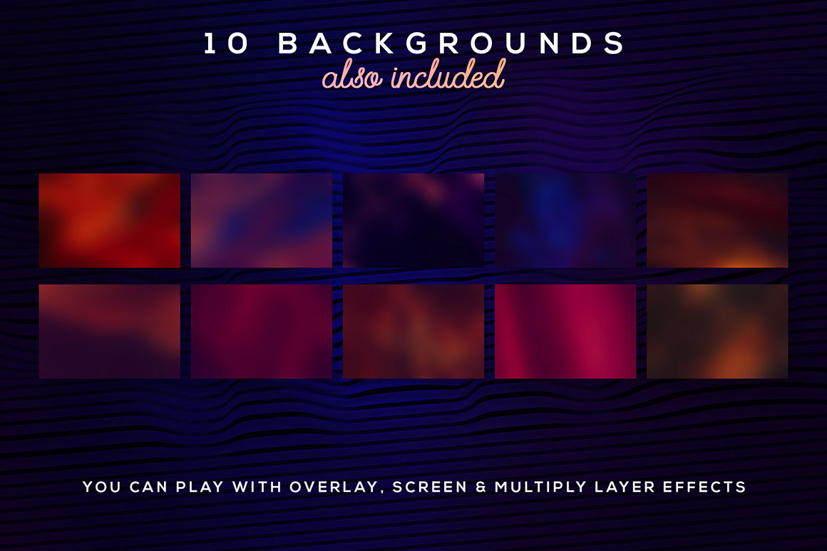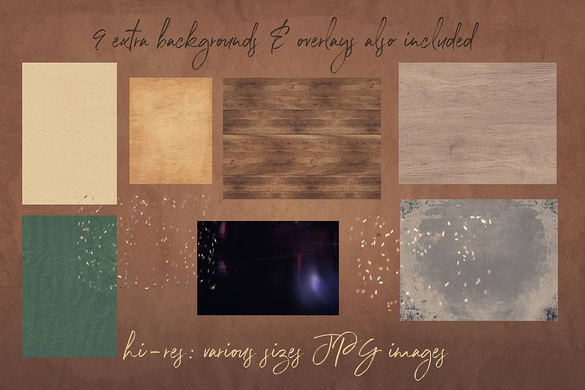 - 9 hi-res JPG or PNG backgrounds or overlays (hi-res – various sizes)