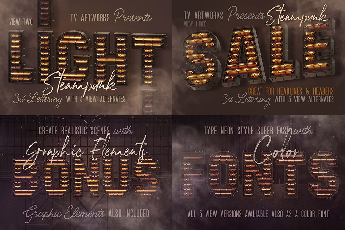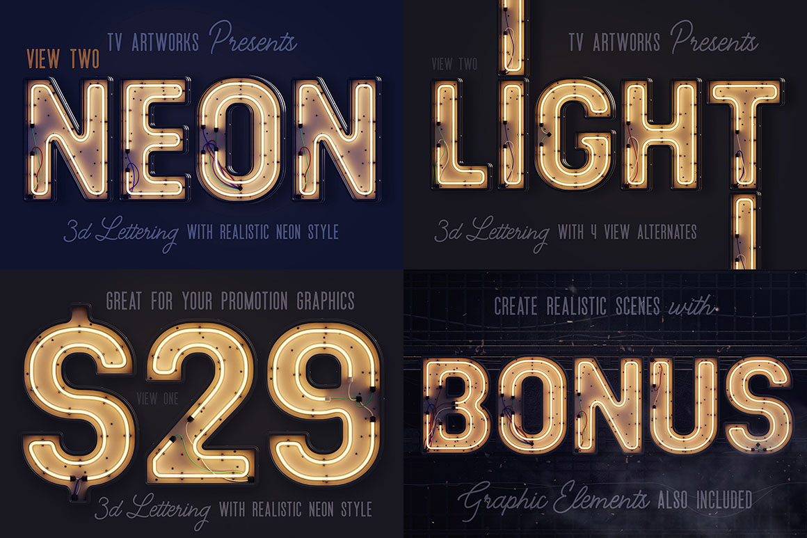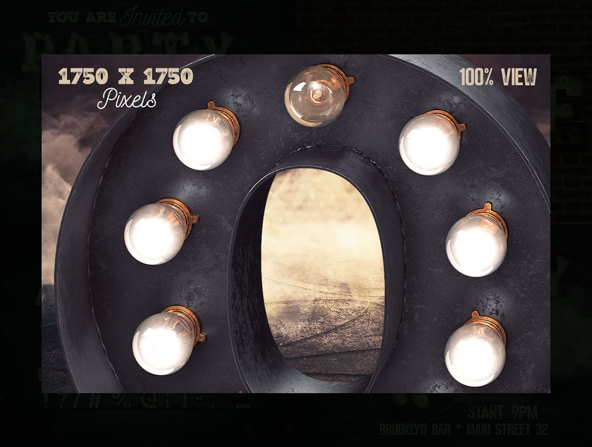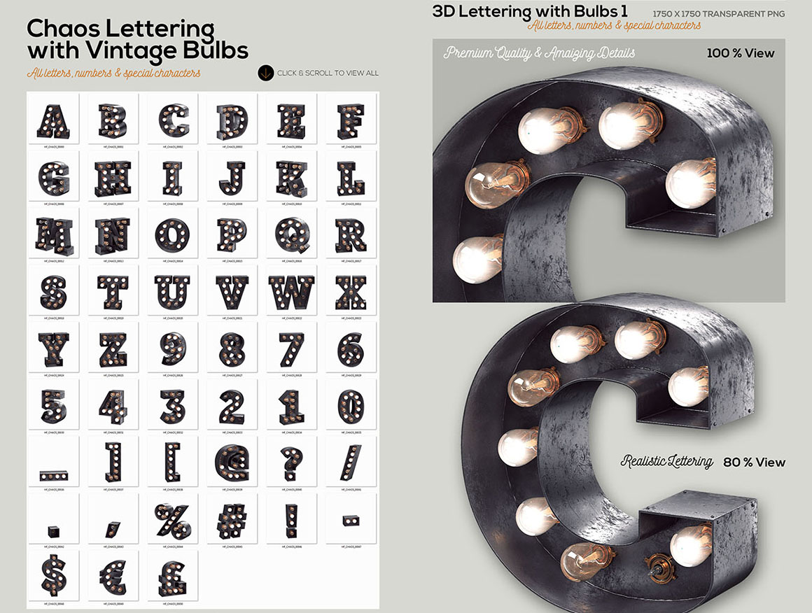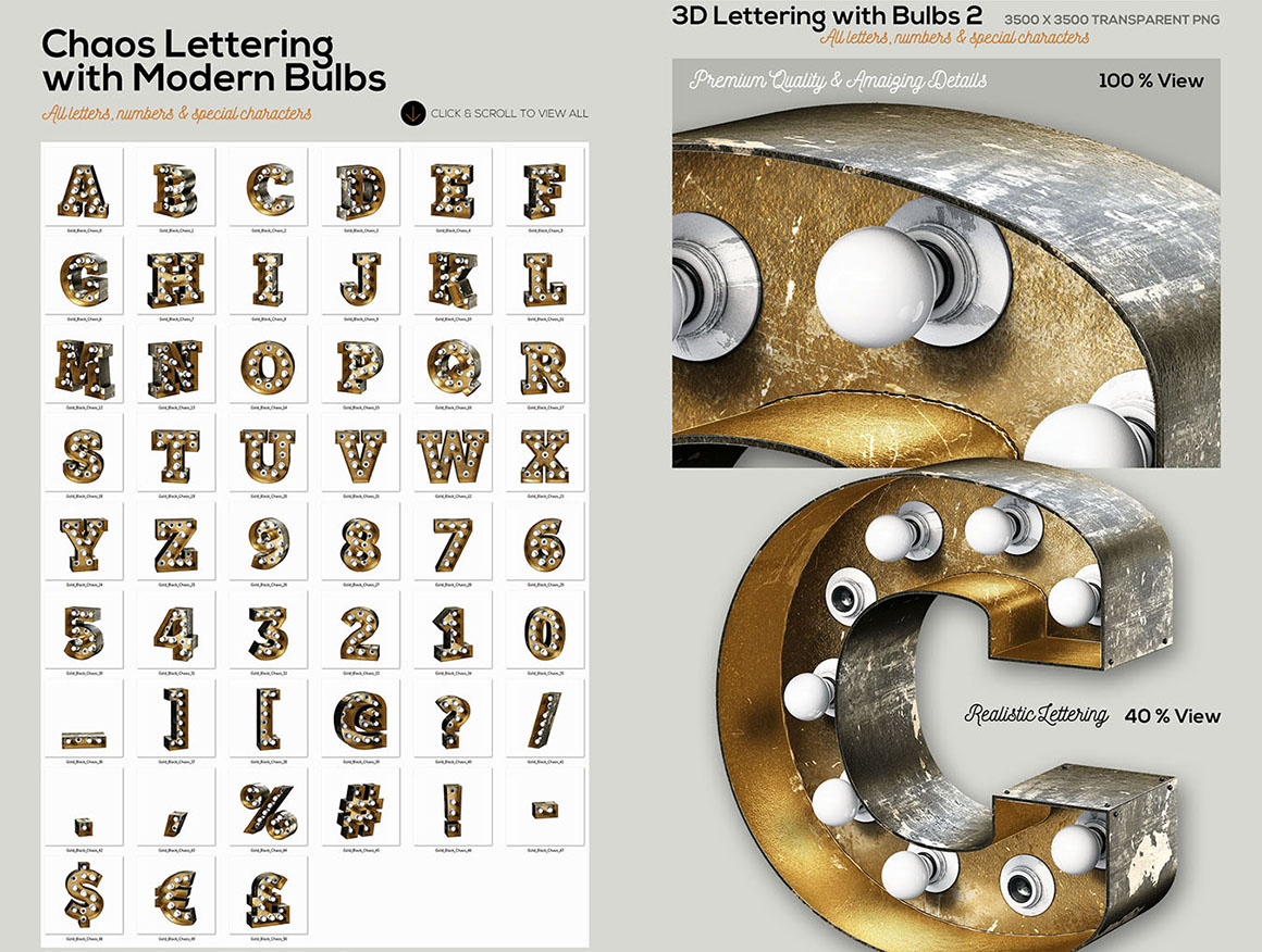 If you need just 3D lettering with light bulbs (without masks, elements, shapes or scene templates) for your new project – this special bundle with 3 different 3D letterings is something for you! You’ll find here 3 lettering types with light bulbs – front view lettering & 2 chaos letterings. All these letterings are great for any print or web projects, so maybe it’s time to add something creative and unique to your typography toolbox 😉