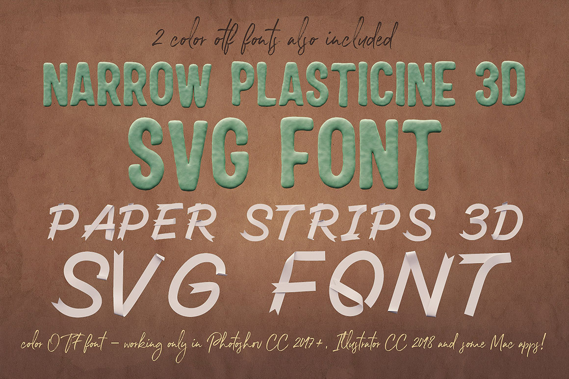 - 3 color OTF fonts – working only in Photoshop CC 2017+, Illustrator CC 2018 and some Mac apps!