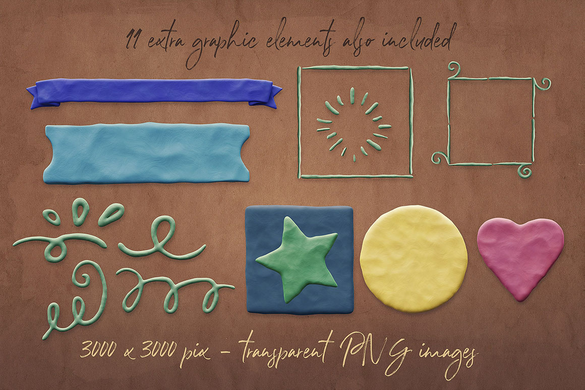 - 8 transparent PNG letterings: 4 plasticine + 4 extra (3000 x 3000 pix)