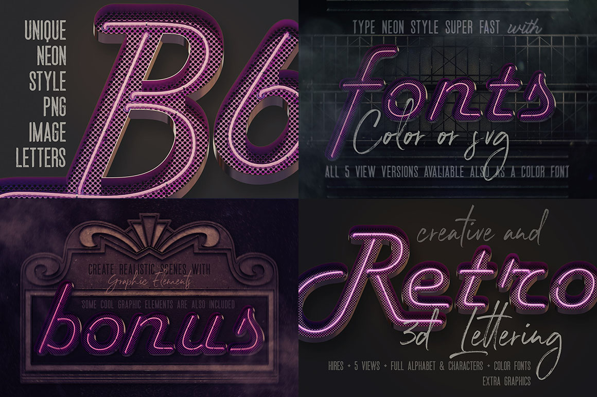 7 various NEON style 3D sets with 29 lettering sets, color SVG fonts & graphic elements!