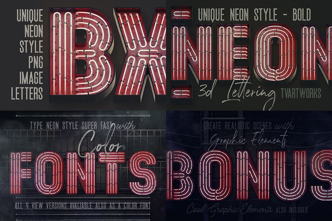 If you are looking for some realistic neon style lettering & graphic ellements then you are at the right place because here you will get a great set of 3D style letterings, color fonts & bonus graphic elements for your new artistic projects. You’ll find here 29 view types lettering sets & color fonts + bonus lettering & graphic elements great to create your own neon typography scenes… These graphics are in hi-res transparent PNG so all are great for your new web design or any print design projects. Enjoy 😉