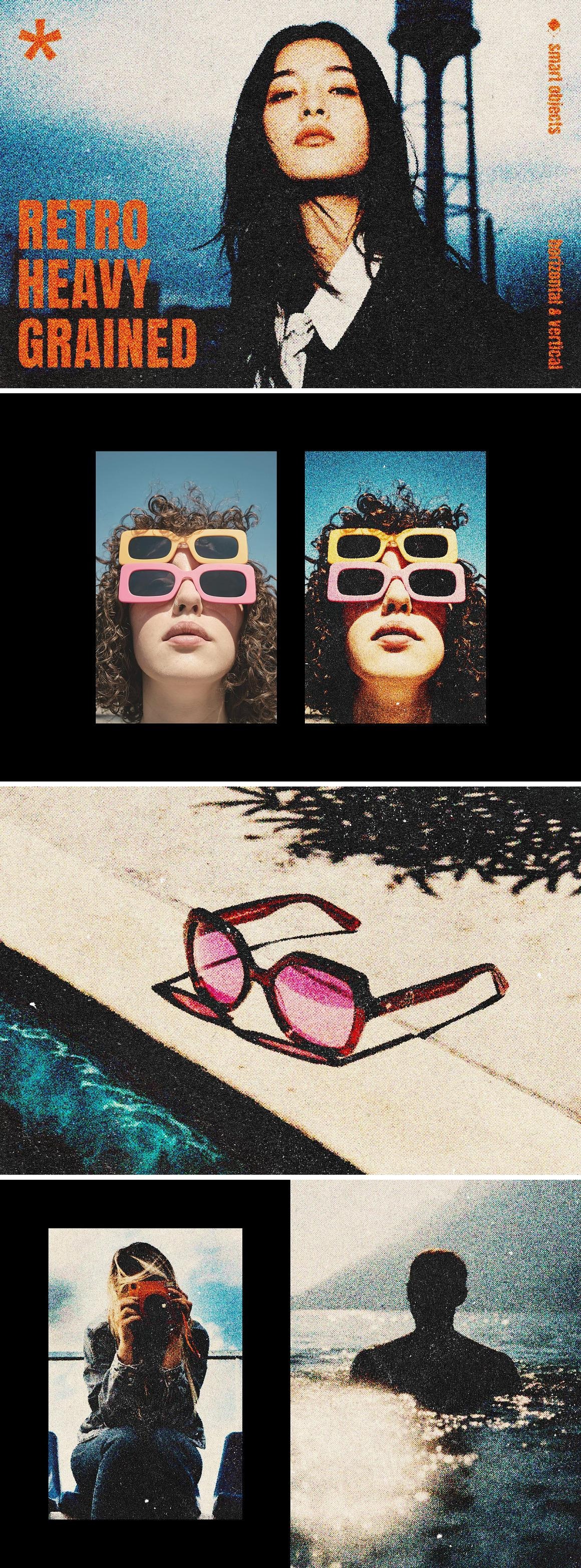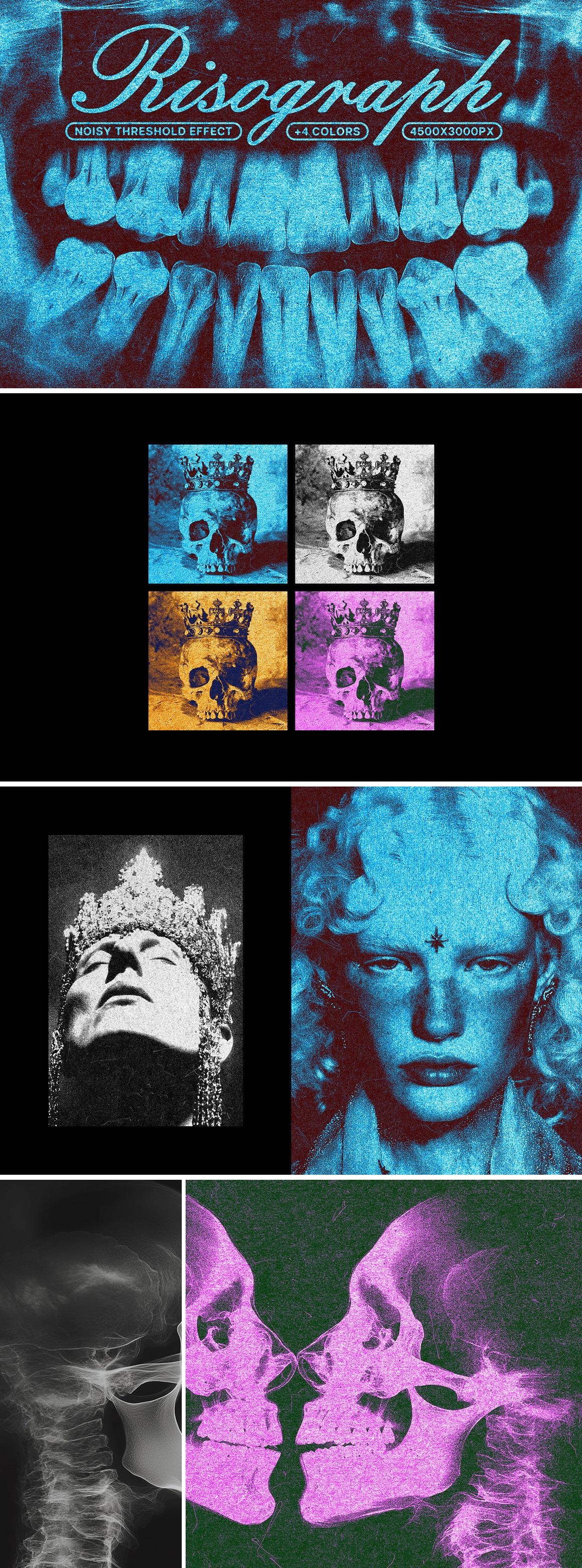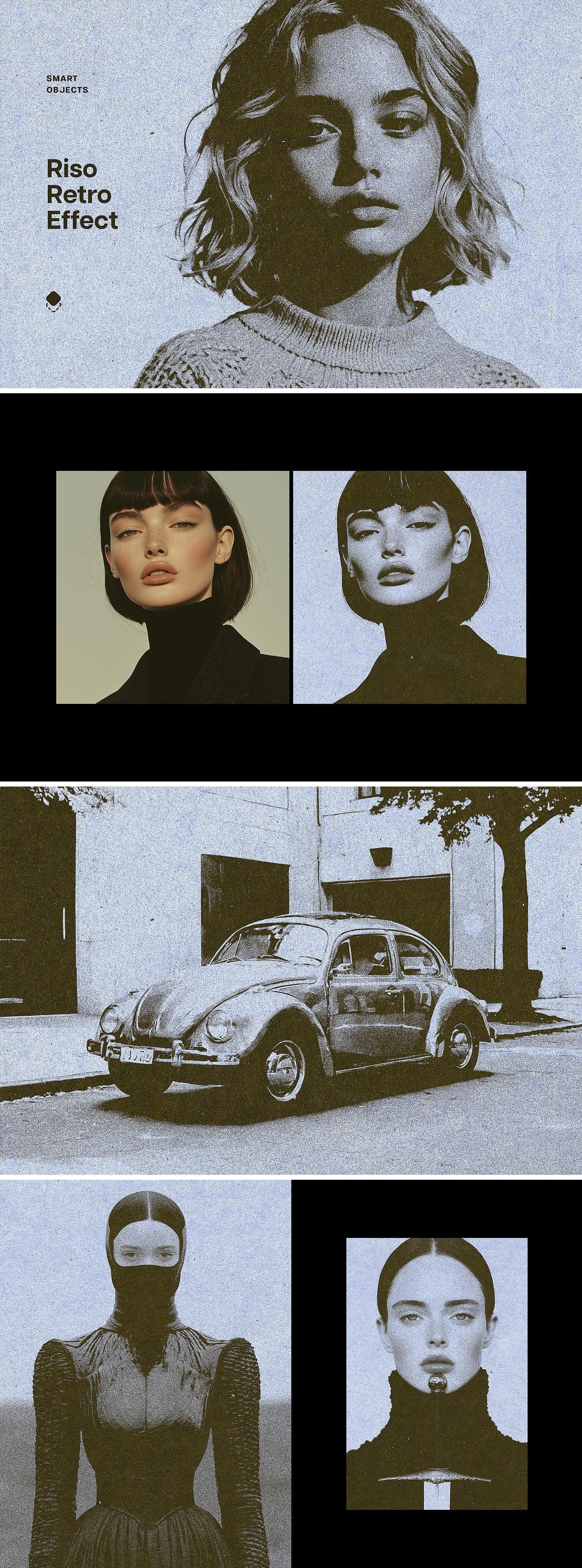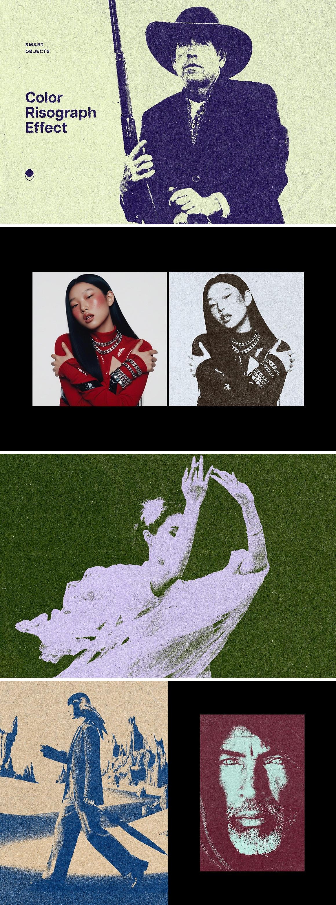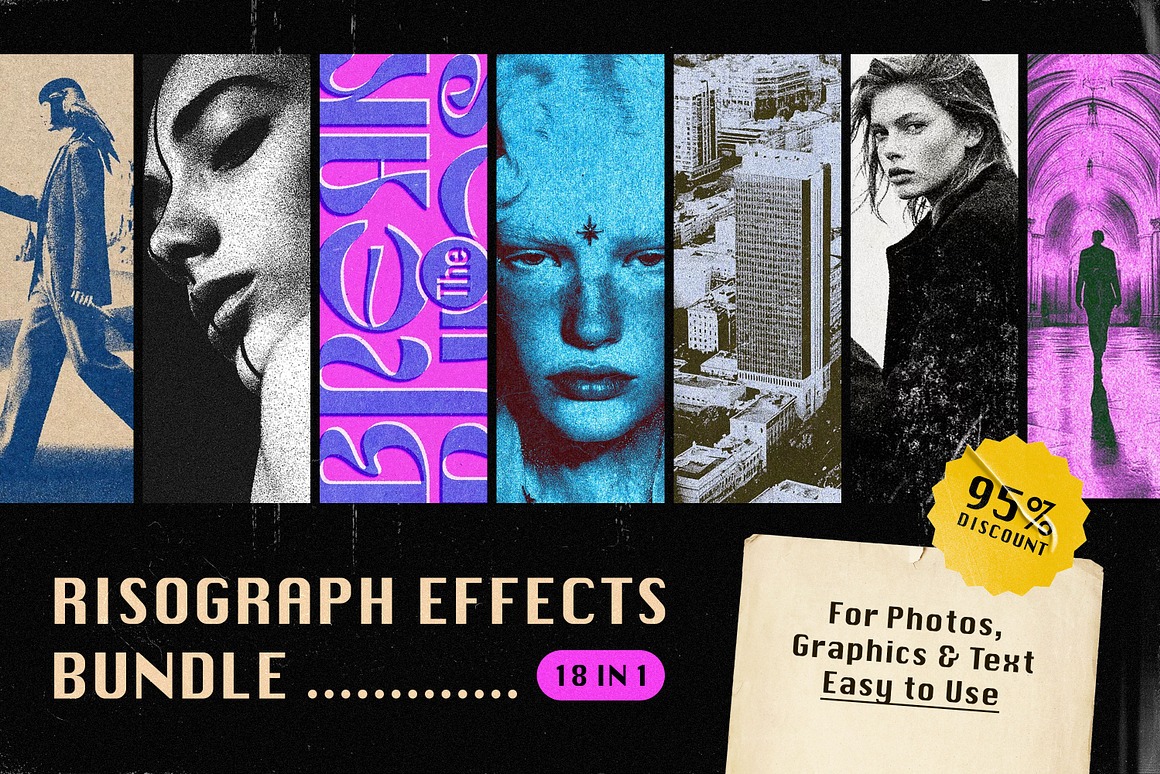 We’ve soaked this collection in soy-ink risograph aesthetics. It comprised heavy grain, off-register color passes, halftone bloom, and the slight fuzz. Inside, you’ll find 16 Photoshop effects that range from canonic overprint and paper-soft noise to aggressive misprints, grunge risoprints, and retro copy artifacts. The resources allow almost infinite customization and editing: e.g., you can switch ink colors, adjust grain intensity, experiment with paper, and more.