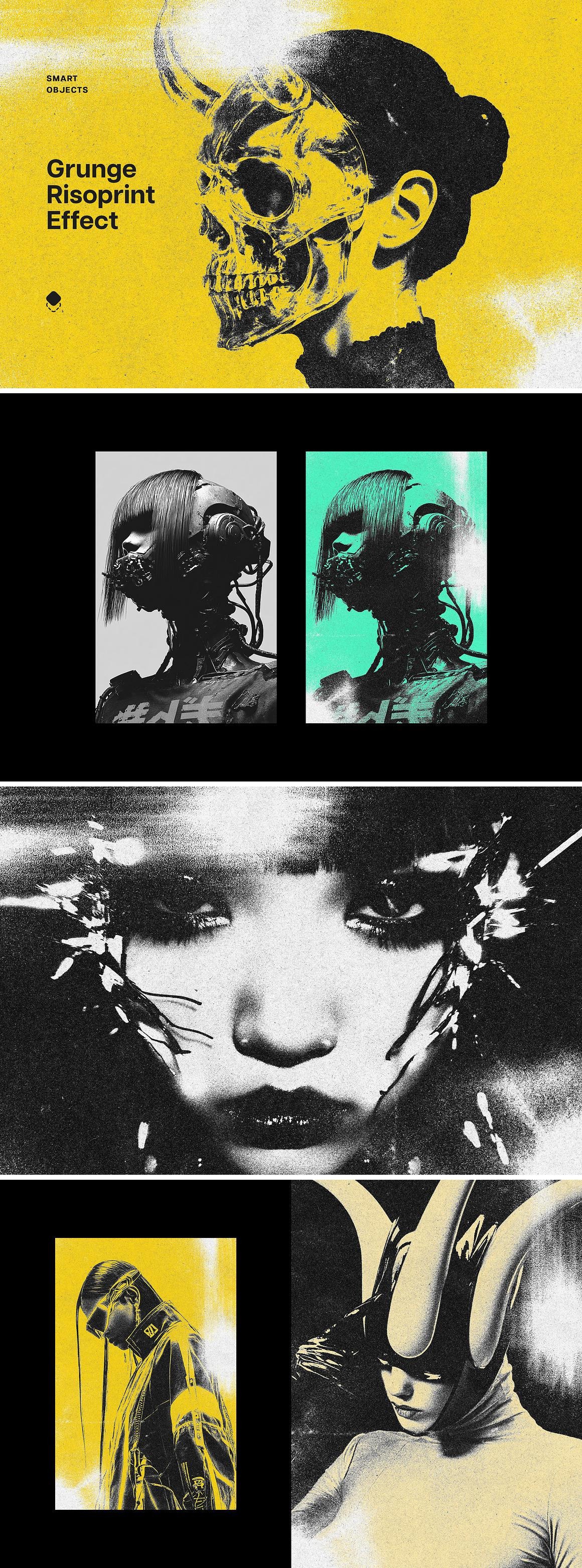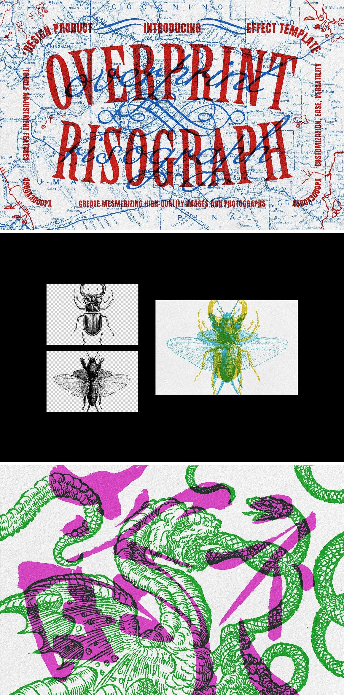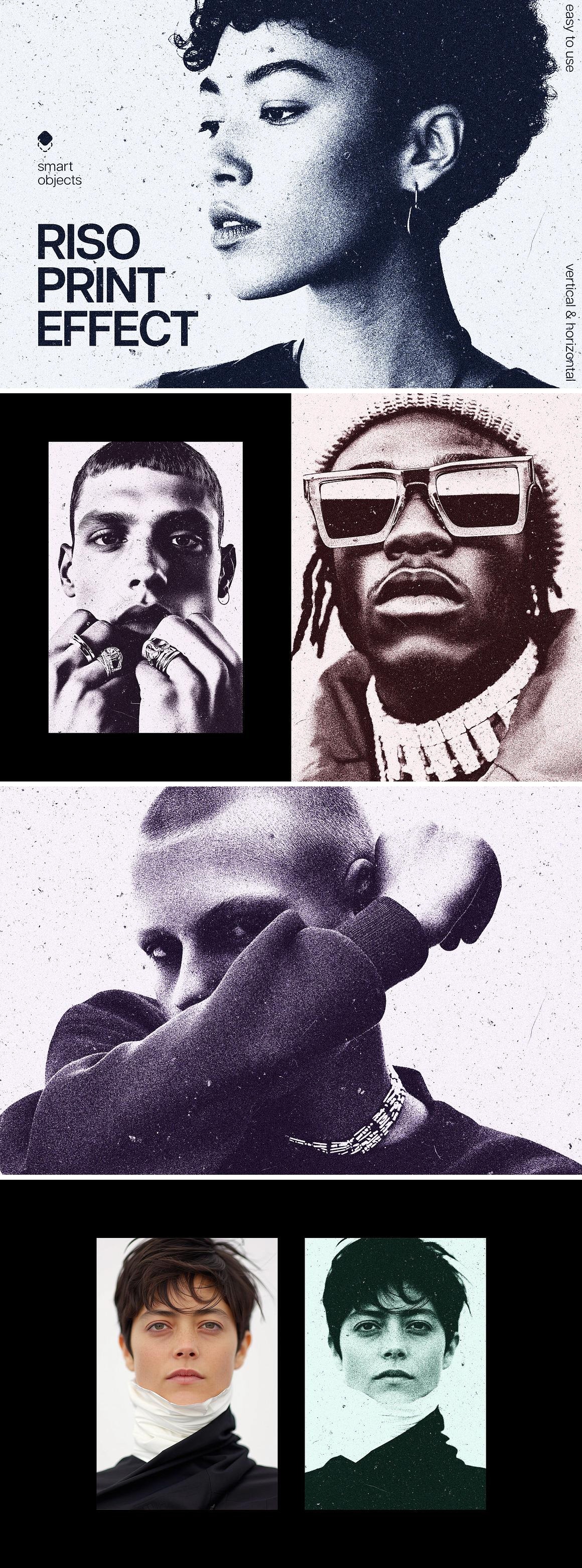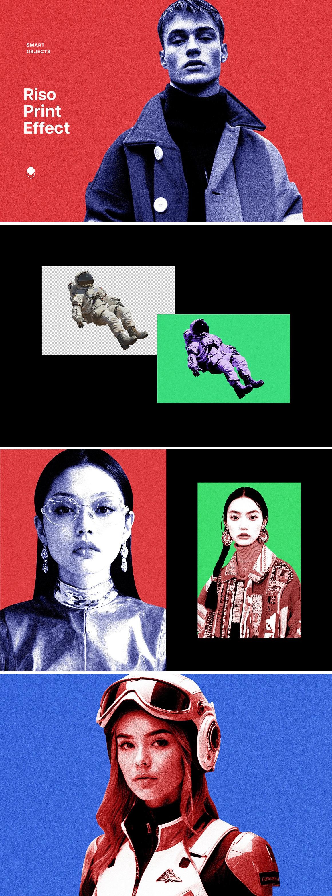 We’ve soaked this collection in soy-ink risograph aesthetics. It comprised heavy grain, off-register color passes, halftone bloom, and the slight fuzz. Inside, you’ll find 16 Photoshop effects that range from canonic overprint and paper-soft noise to aggressive misprints, grunge risoprints, and retro copy artifacts. The resources allow almost infinite customization and editing: e.g., you can switch ink colors, adjust grain intensity, experiment with paper, and more.