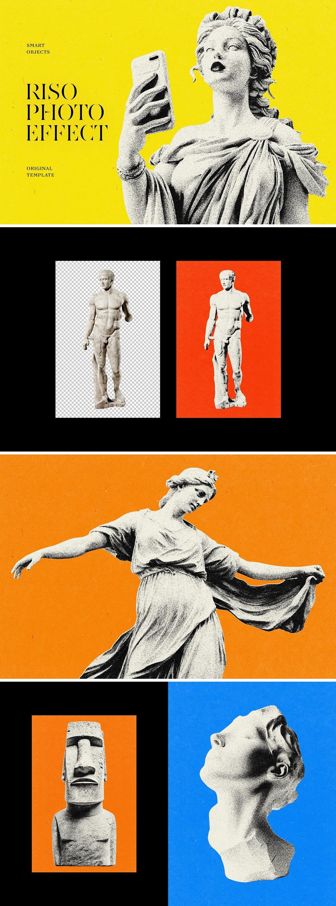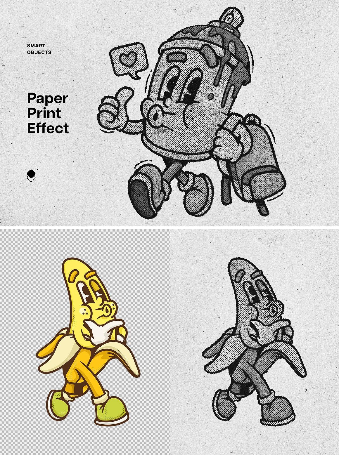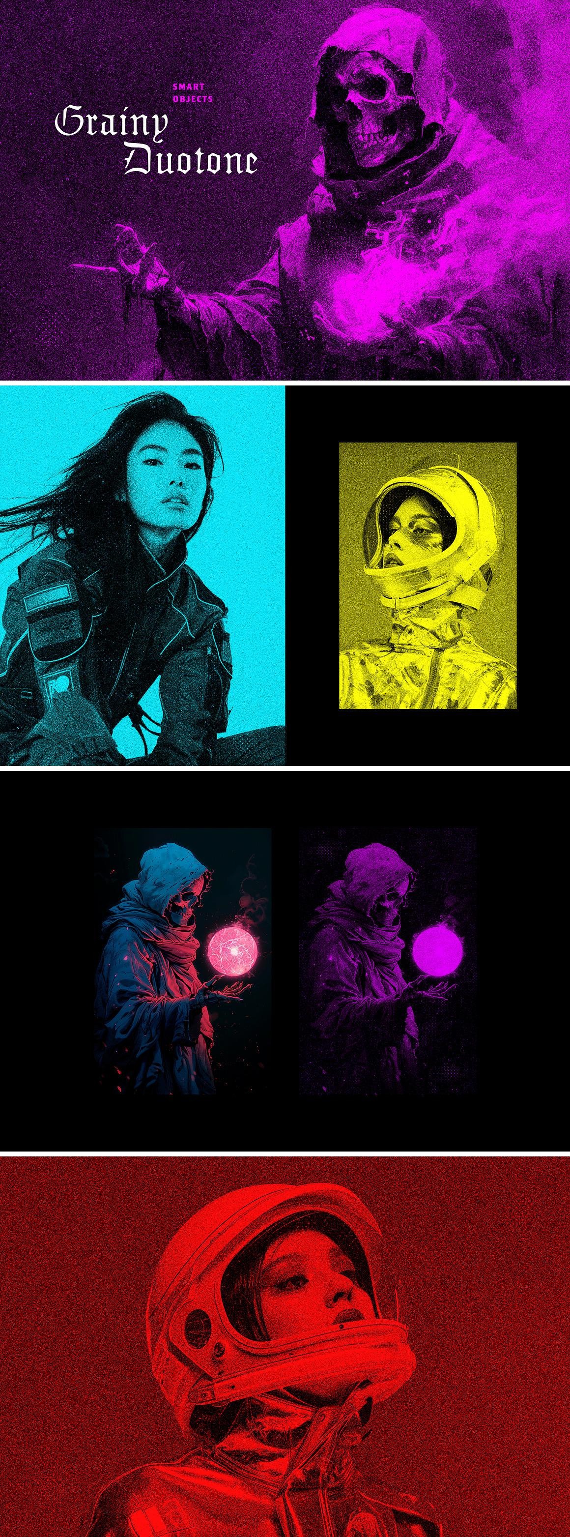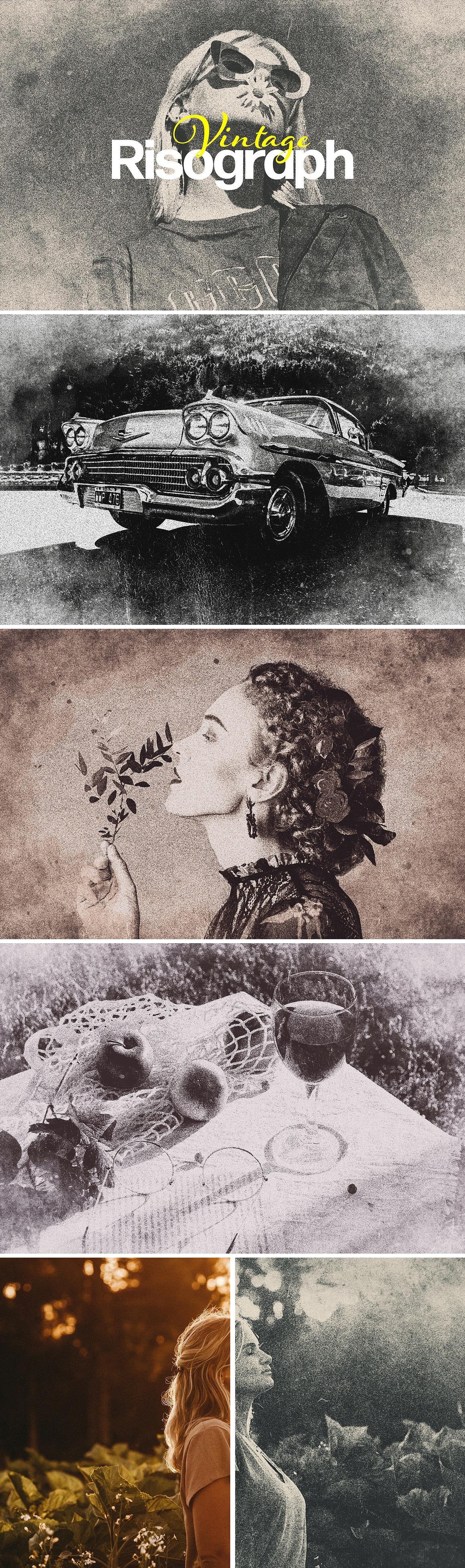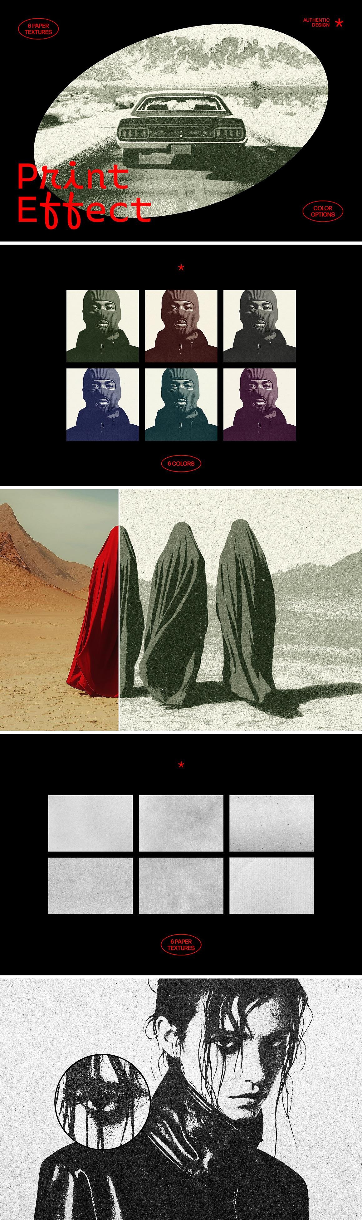 We’ve soaked this collection in soy-ink risograph aesthetics. It comprised heavy grain, off-register color passes, halftone bloom, and the slight fuzz. Inside, you’ll find 16 Photoshop effects that range from canonic overprint and paper-soft noise to aggressive misprints, grunge risoprints, and retro copy artifacts. The resources allow almost infinite customization and editing: e.g., you can switch ink colors, adjust grain intensity, experiment with paper, and more.
