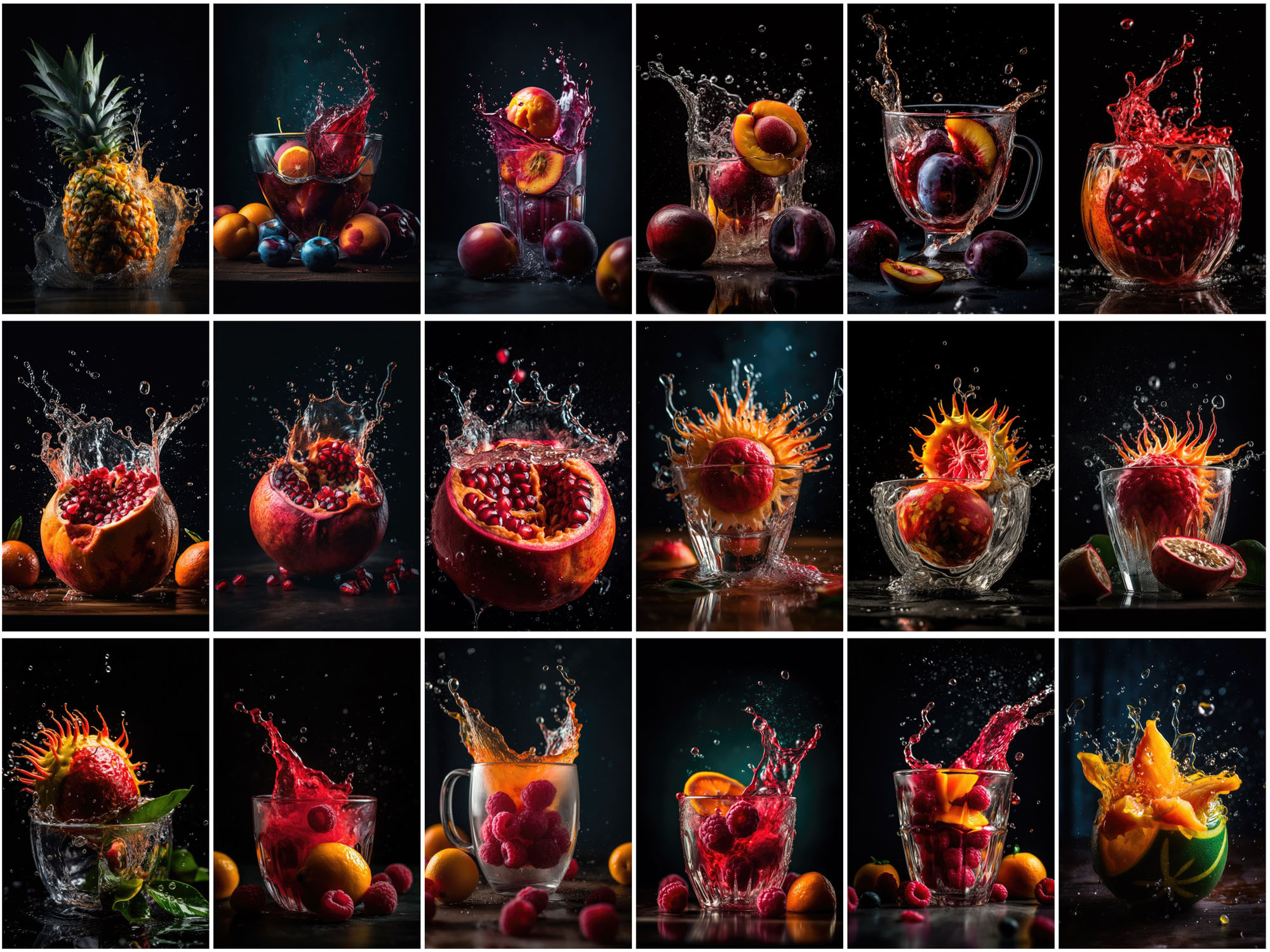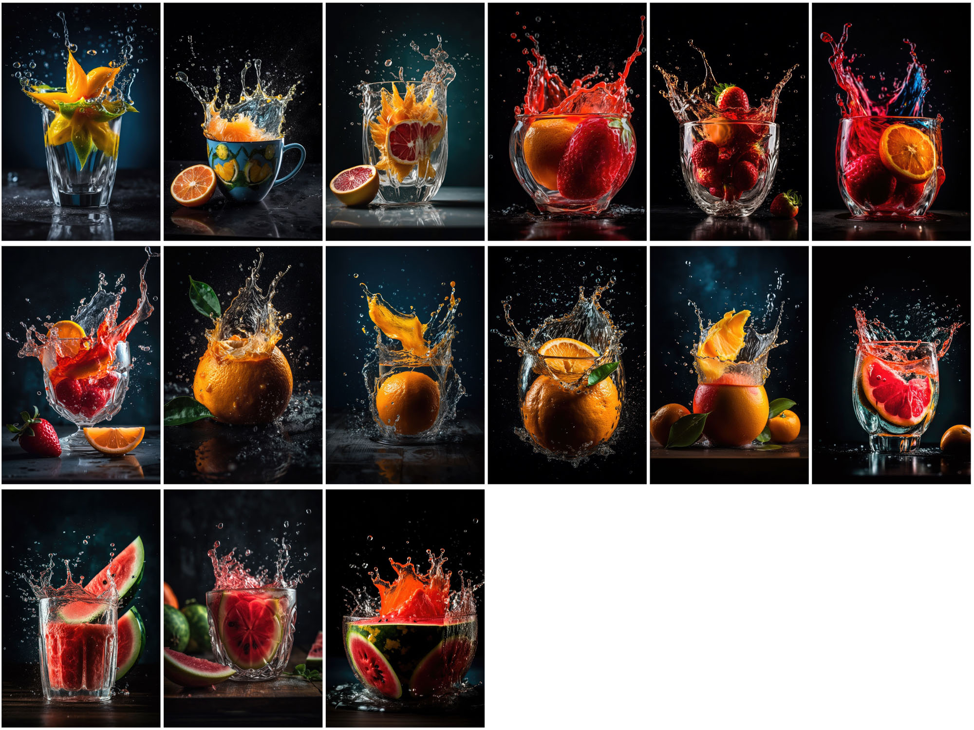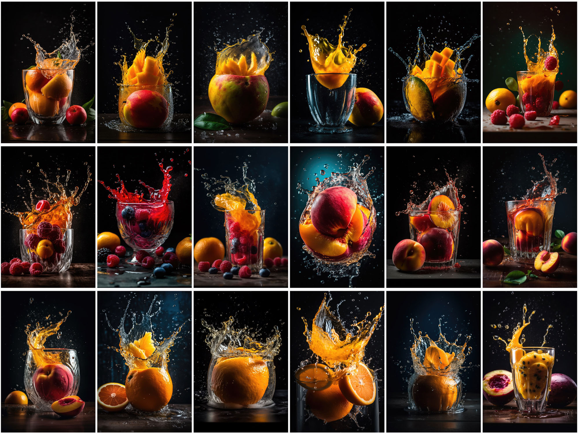 - Array of Fruit Juice Splashes: Features a wide selection of fruit splashes, including apple, avocado, banana, blackberry, cherry, grapefruit, lemon, lime, mango, orange, pineapple, strawberry, watermelon, and more, adding a dynamic and refreshing touch to your designs.