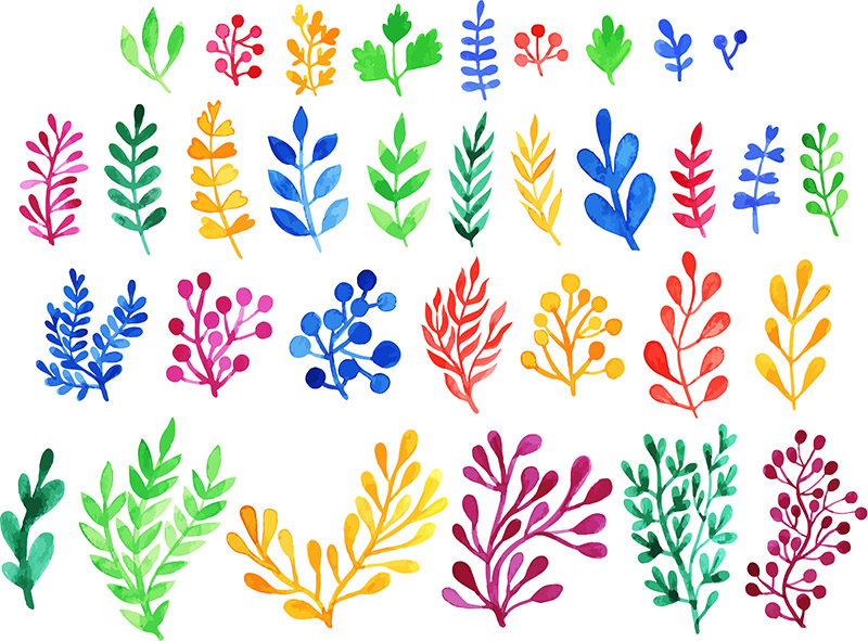 Set of various vector watercolor hand-painted floral elements. Separate floral elements in one file in Adobe Illustrator, vector EPS, + JPEG file (4000×3000 pixels). You can resize and save them in any resolution or dpi.