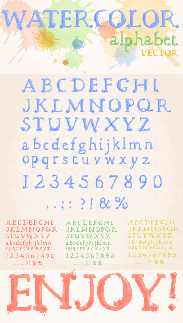 Watercolor letters in vector format.Every letter is grouped individually for easy editing. Four color variations – blue, red, yellow and green. Ai and EPS files included. Jepg preview included.