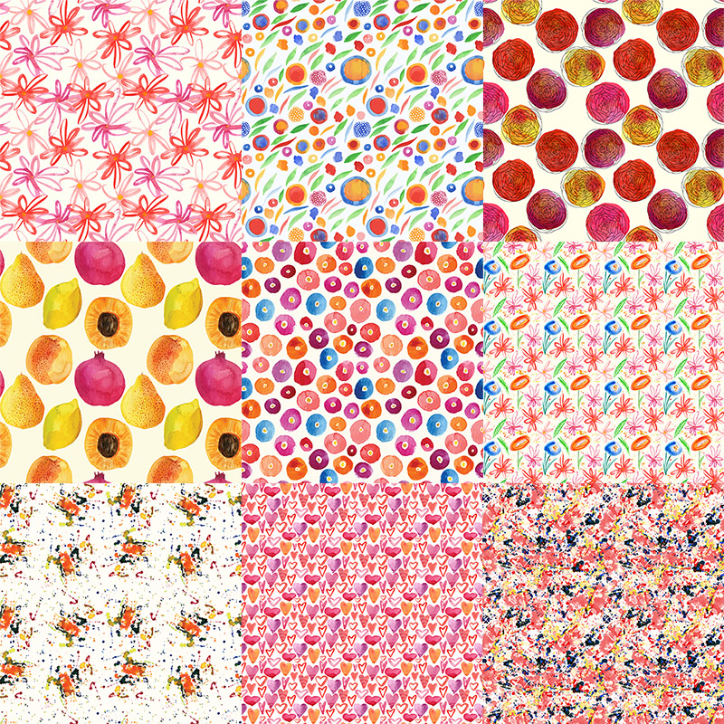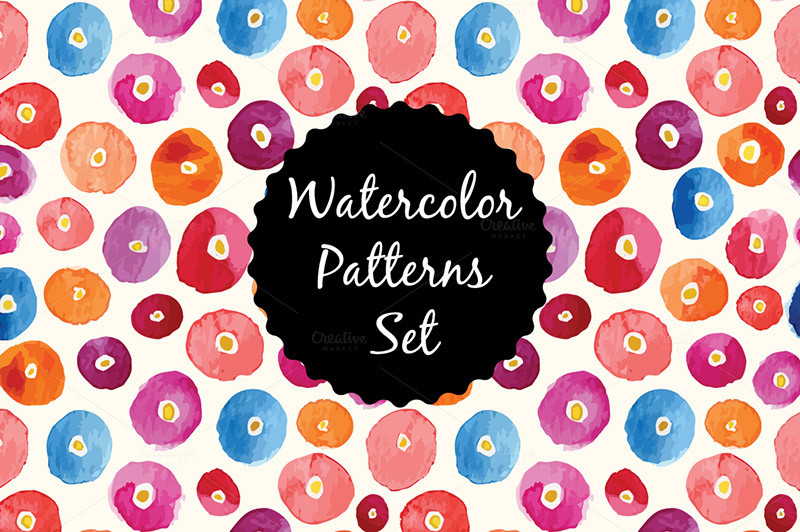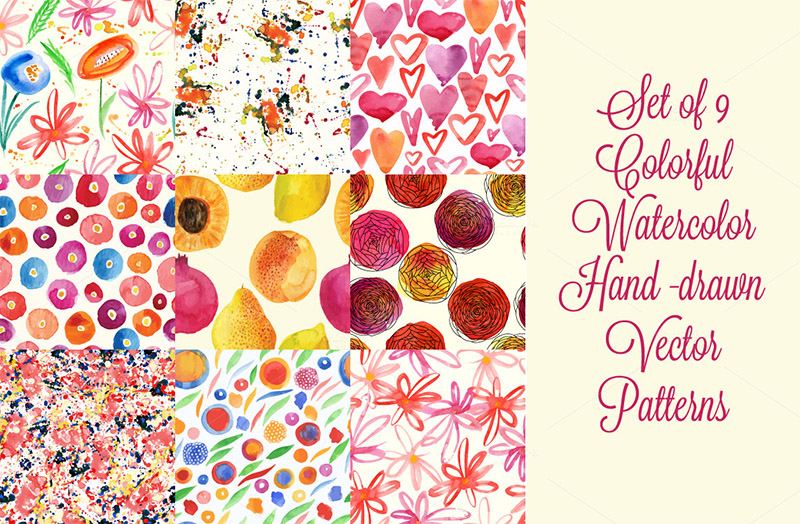 Set of 9 stylish vector watercolor hand-painted patterns. 9 patterns in Adobe Illustrator, vector EPS, + JPEG files (3000×3000 pixels). You can resize and save them in any resolution or dpi.
