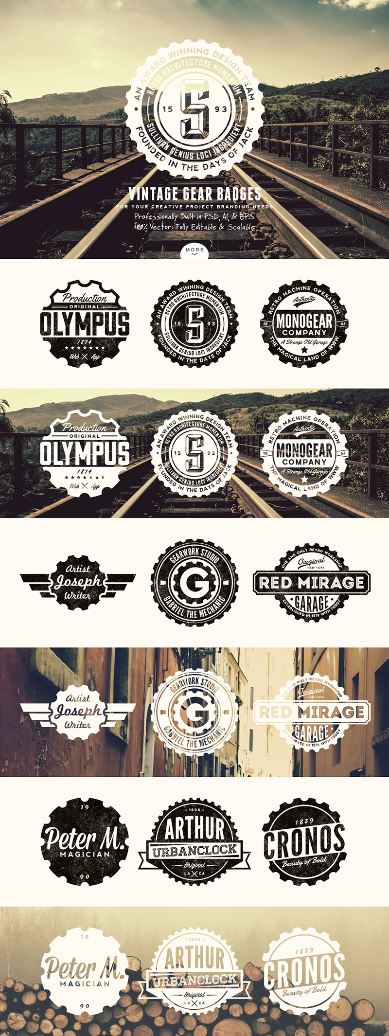 Looking for outstanding graphics to brand your creative project? Here’s a set of 27 vintage gear badges which can be used as your logos, labels, badges, watermark and other identity and branding materials. Brand your creative projects with these retro style logos and it’ll bring out a strong branding presence and vintage handcrafted impression.
