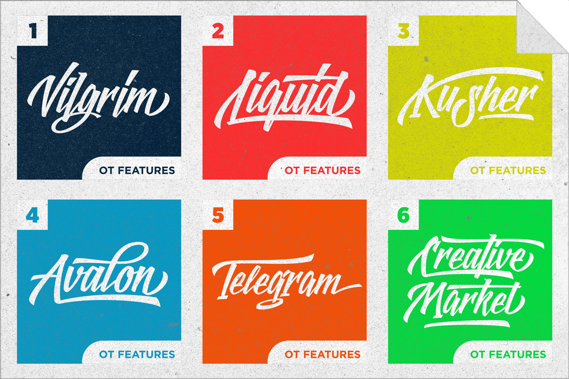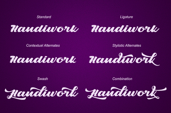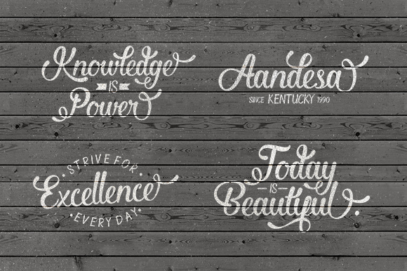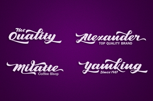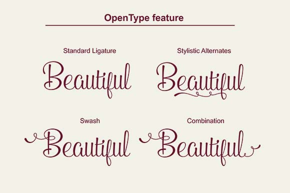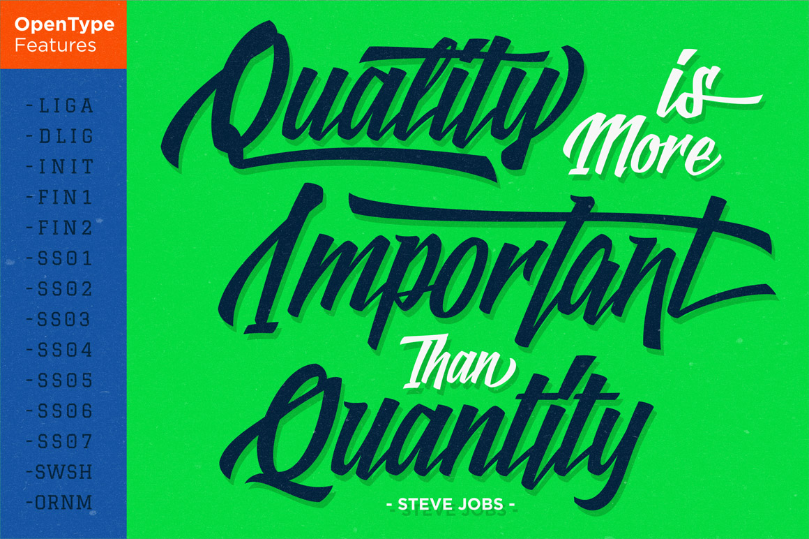 Aleandra Script is a typeface that experiences adopting two building models: the typographic (with repetition of shapes) and the script (with the freedom of writing). The models are presented in a subtle, unobtrusive way and mainly without conflicts. The essence of each personality is present, coexisting harmoniously and enjoying the same stylistic space. It was designed as a display typeface that contains 408 glyphs in total and 211 alternative characters to improve your design. It is suitable for logo, packaging, headline, poster, t-shirt, etc. After careful evaluation of the connections between characters, intelligent standards have been established for use of the OpenType feature, that used together with the ‘stylistic alternates, stylistic sets, and swash’ feature, offers a gentle and friendly pace. It can be accessed by using OpenType savvy program such as Adobe Illustrator and Adobe InDesign. The Manual that show you how to use OpenType feature was included in the package.
