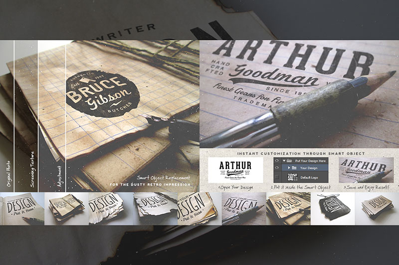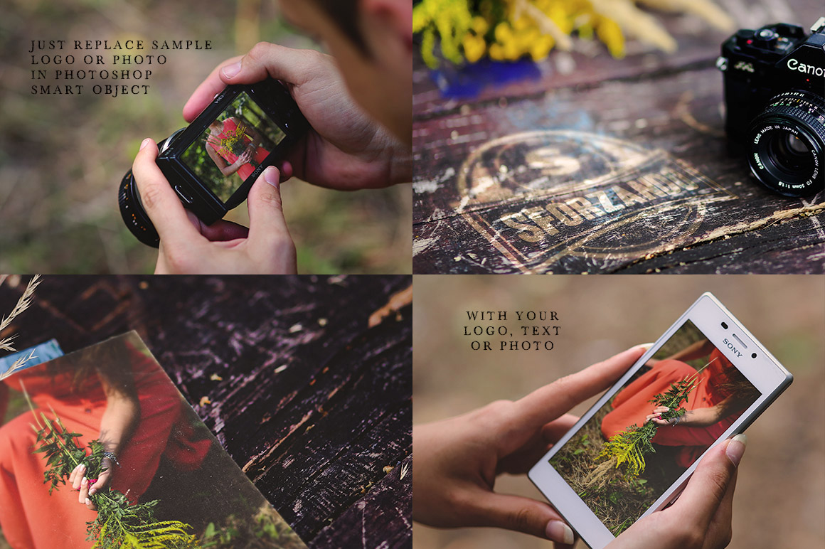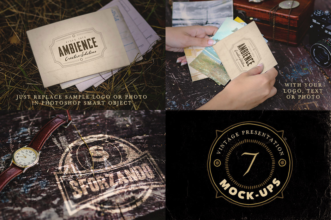 7 presentation photoshop mockups. Great for presentation of your logo, badge, sign design, text or photos. Very easy to use. Just few seconds and you’ll have realistic photo presentation. All mock-up templates are in Photoshop files with hi-res 2600×1800 pixels. Smart objects included to easy replace sample image with your logo or photo. Realistic results in seconds! Also 25 hi-res ( 5472×3648, 240dpi ) photos included! All photos are in retro/vintage style. Great for presentation of your new product or font.