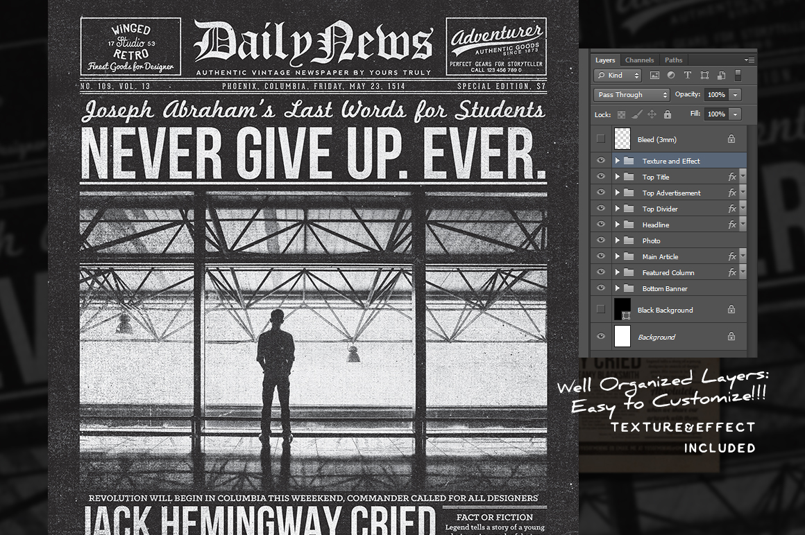 A good old vintage newspaper front page A4 flyer template ready to be customized and printed. Customize this flyer to work with your latest design project, it’ll bring out vintage branding impression and retro creativity of your project.