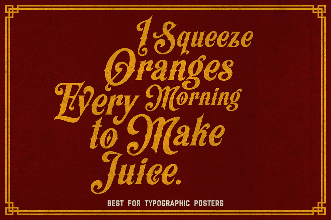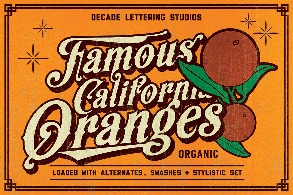 Back to 1880-1900. When a number of events were coming together ; the country was evolving from a local market economy to mass merchandising, rail systems were being built and color lithography was becoming more affordable. The first rail cars full of oranges were being shipped from Southern California to the East – what a treat during a cold winter’s day. Labels were pasted on every fruit crate and these labels had large images of oranges and orange groves. With technological advances in soldered cans, canneries popped up all over the country. In order to market their products many California Canneries pooled their resources to form the California Fruit Canners Assn. in 1899.This font was inspired from that era. Loaded with alternates, swashes, stylistic and multilingual support.
