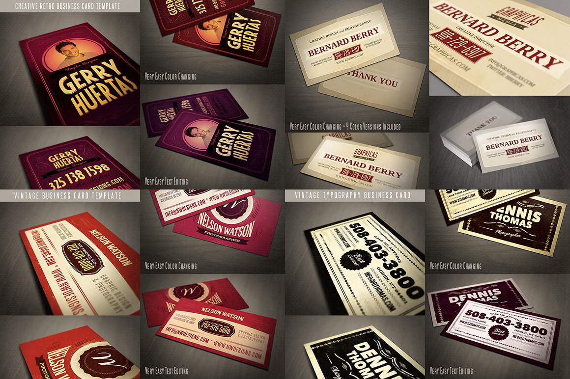 6 Business Card Templates (3.5” x 2”). Fully layered & customizable .PSD files (front and back). Print-ready CMYK files at a resolution of 300 DPI. All templates include bleeds, trims and guidelines These print templates are very simple to use and customize. You can change the texts, colors and images in just a couple of moments!