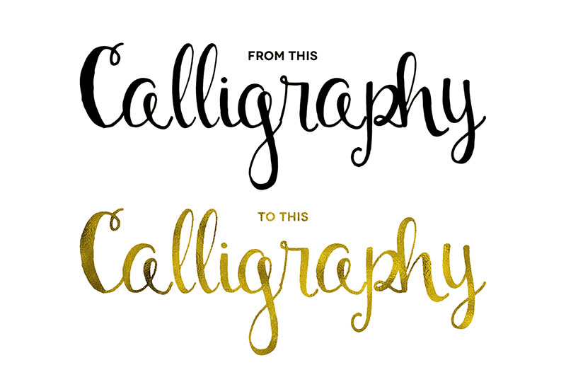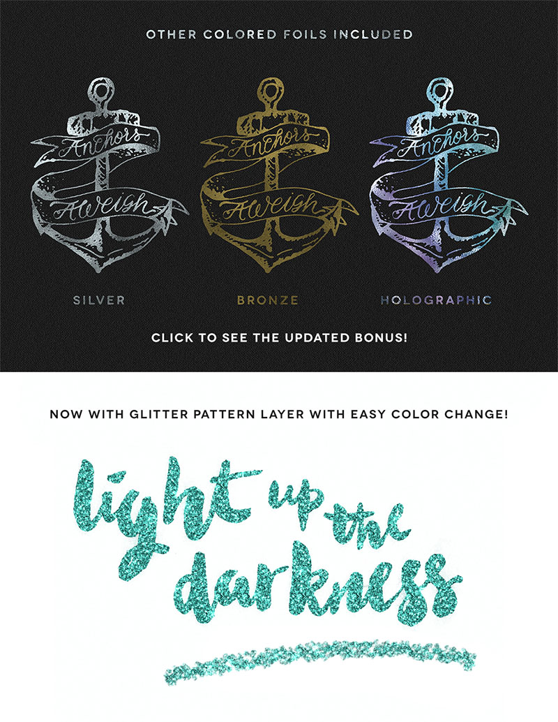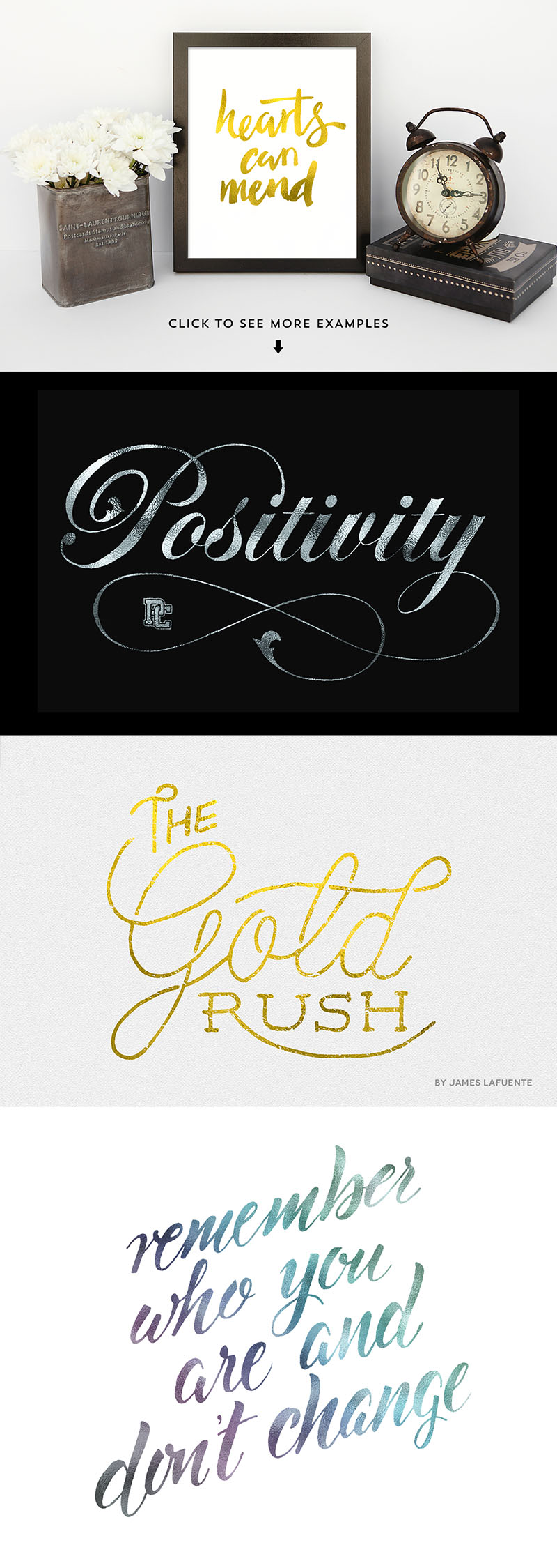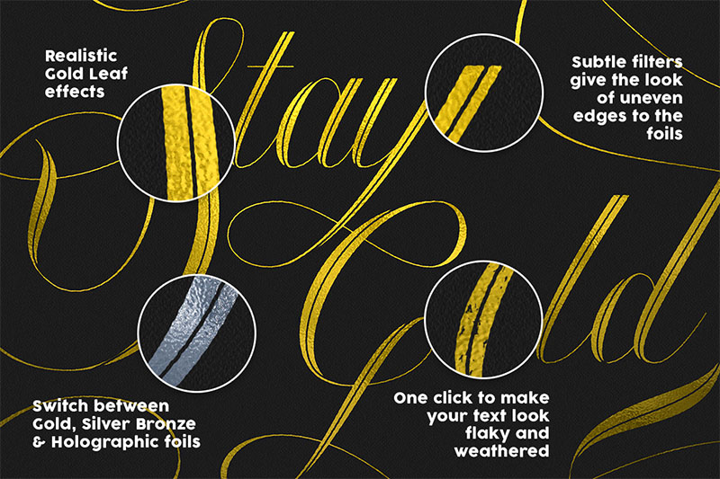 Add a touch of class to your type, hand lettering and calligraphy with realistic Gold Leaf effects in this easy to use Photoshop smart PSD. Just drop in your work into the smart object and a Gold Leaf texture is instantly applied to it. But it’s not just gold. You get the choice of Silver, Bronze or Holographic textures and also the ability to make your own foils with my unique actions. Just choose the colors and it makes the foil for you, ready to be place in the PSD. Also included is a one click texture layer which adds a flaky look to the leaf making it look aged and weathered. Check out the video demo to see how easy it is to use: http://vimeo.com/107031130