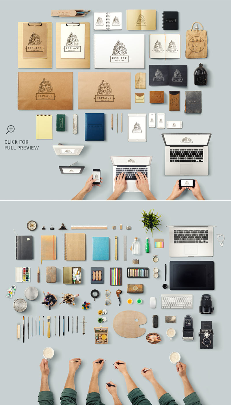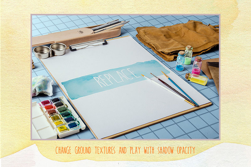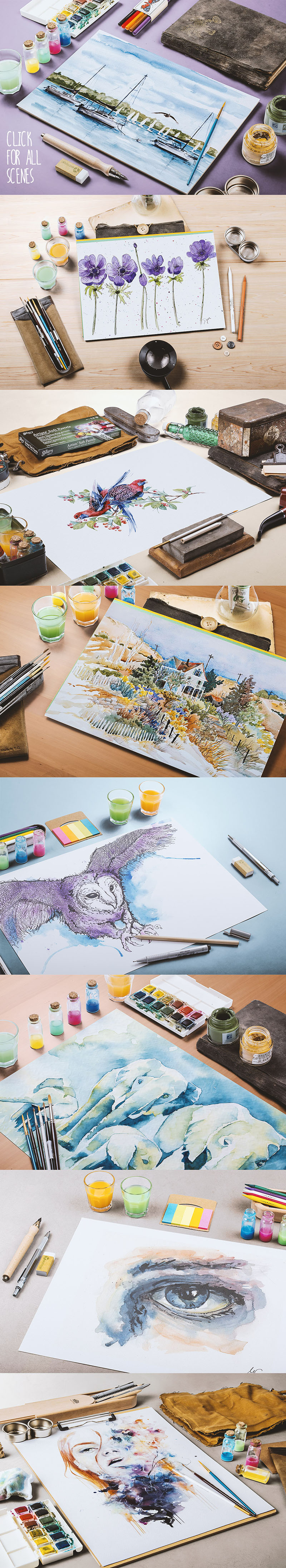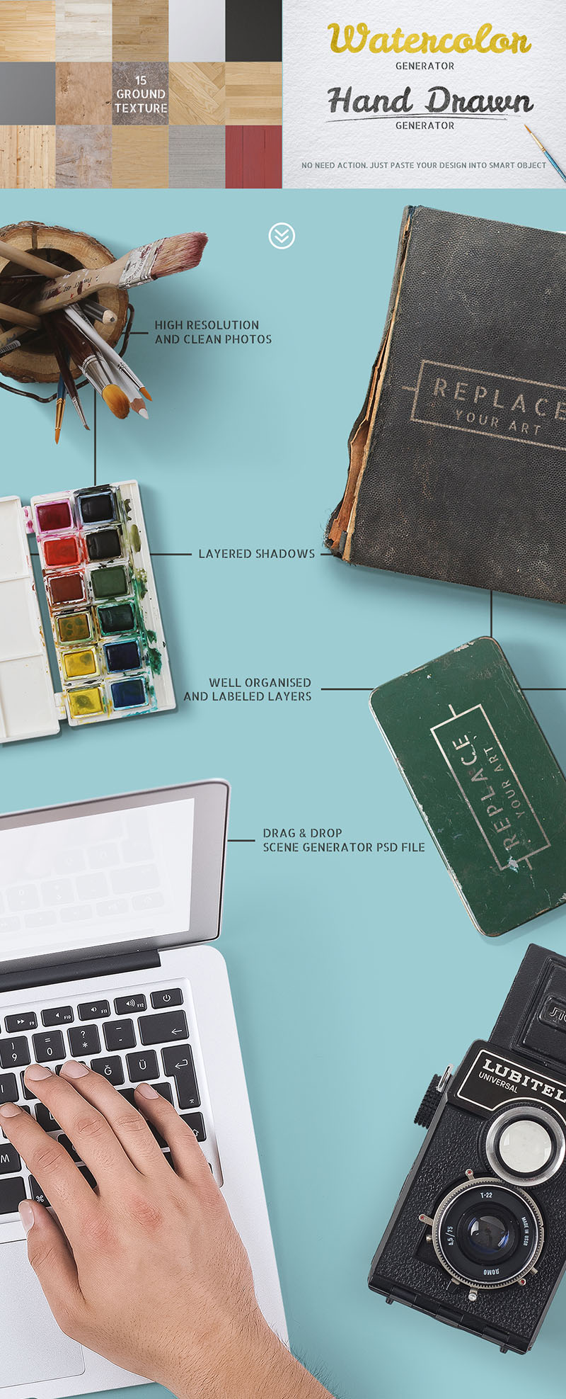 A great pack for artists. Now you can show your works in a professional way. Select from any awesome items. Old boxes, brushes, old stuffs, pens, papers, sketch books etc. Paste your designs into them or make old box or old sketch notebook covers with your special signature. Also you can convert your design into watercolor. You will get a “Watercolor Generator” with this file and get realistic watercolor effect with just pasting into smart object. *And “Hand Sketched” with new update. This file includes over 80 items, all of them grouped and layered very well, so you can drag&drop any items into “Scene Generator” and move and rotate them as you want. *With new update over 90 items. And also this Scene Generator includes 9 high resolution ground textures. You can put your items on to any textured ground. *15 textures with new update.